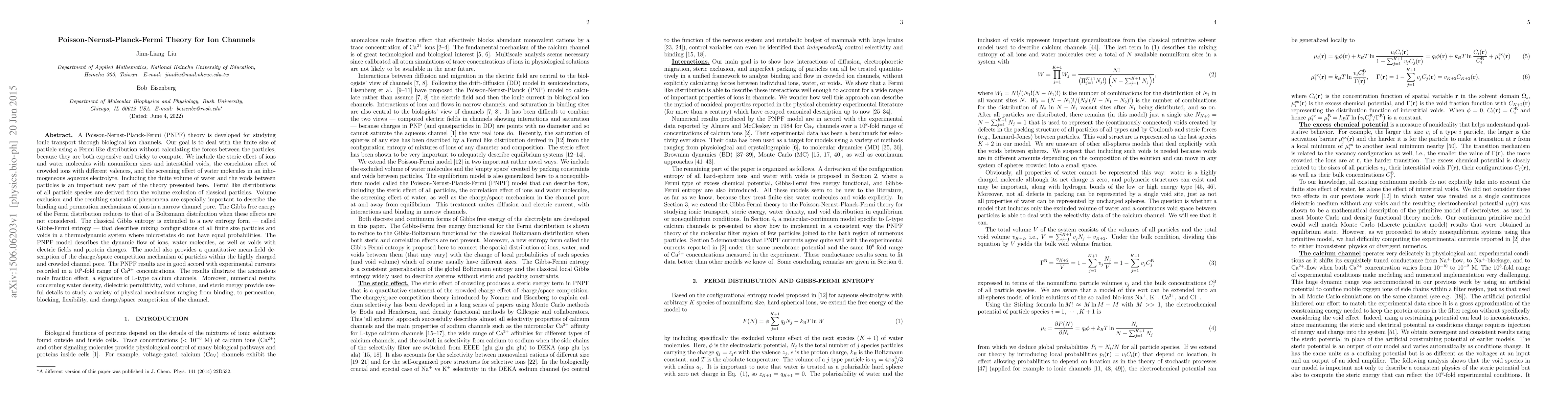 The Poisson-Nernst-Planck-Fermi (PNPF) theory models ionic transport through ion channels by incorporating particle size effects and Fermi-like distributions, achieving good agreement with experimental data on calcium ion currents. The theory extends classical Gibbs entropy to account for nonuniform particle sizes and voids, providing insights into various physical mechanisms within the channel.