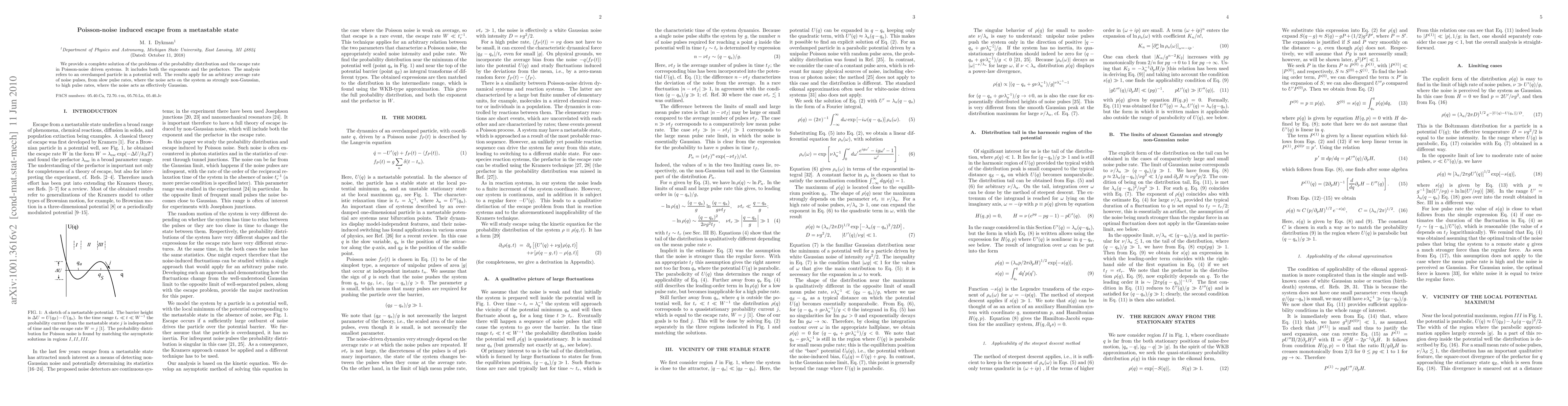 This research offers a comprehensive solution for understanding escape from metastable states in systems driven by Poisson-noise. It covers probability distribution and escape rates for varying noise pulse rates, from non-Gaussian to effectively Gaussian noise, applicable to an overdamped particle in a potential well.