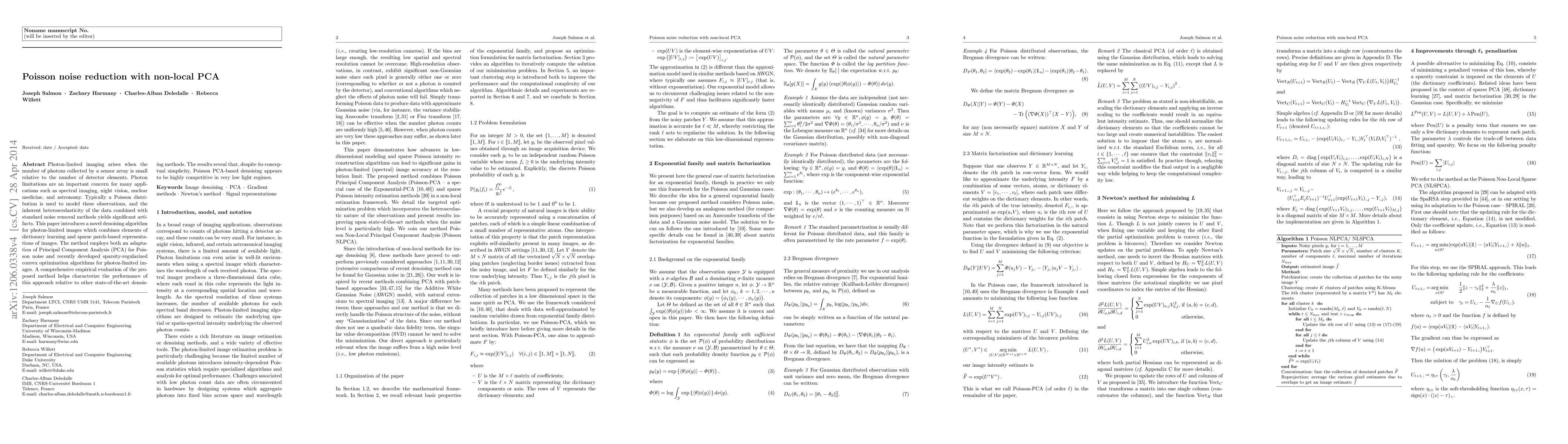 Photon-limited imaging arises when the number of photons collected by a sensor array is small relative to the number of detector elements. Photon limitations are an important concern for many applications such as spectral imaging, night vision, nuclear medicine, and astronomy. Typically a Poisson distribution is used to model these observations, and the inherent heteroscedasticity of the data combined with standard noise removal methods yields significant artifacts. This paper introduces a novel denoising algorithm for photon-limited images which combines elements of dictionary learning and sparse patch-based representations of images. The method employs both an adaptation of Principal Component Analysis (PCA) for Poisson noise and recently developed sparsity-regularized convex optimization algorithms for photon-limited images. A comprehensive empirical evaluation of the proposed method helps characterize the performance of this approach relative to other state-of-the-art denoising methods. The results reveal that, despite its conceptual simplicity, Poisson PCA-based denoising appears to be highly competitive in very low light regimes.