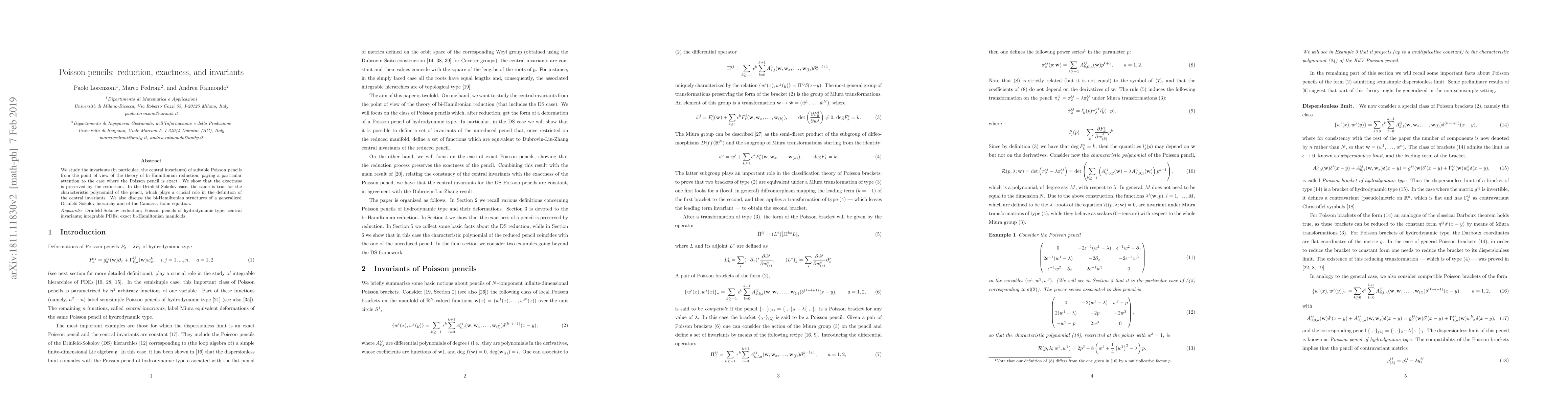 We study the invariants (in particular, the central invariants) of suitable Poisson pencils from the point of view of the theory of bi-Hamiltonian reduction, paying a particular attention to the case where the Poisson pencil is exact. We show that the exactness is preserved by the reduction. In the Drinfeld-Sokolov case, the same is true for the characteristic polynomial of the pencil, which plays a crucial role in the definition of the central invariants. We also discuss the bi-Hamiltonian structures of a generalized Drinfeld-Sokolov hierarchy and of the Camassa-Holm equation.