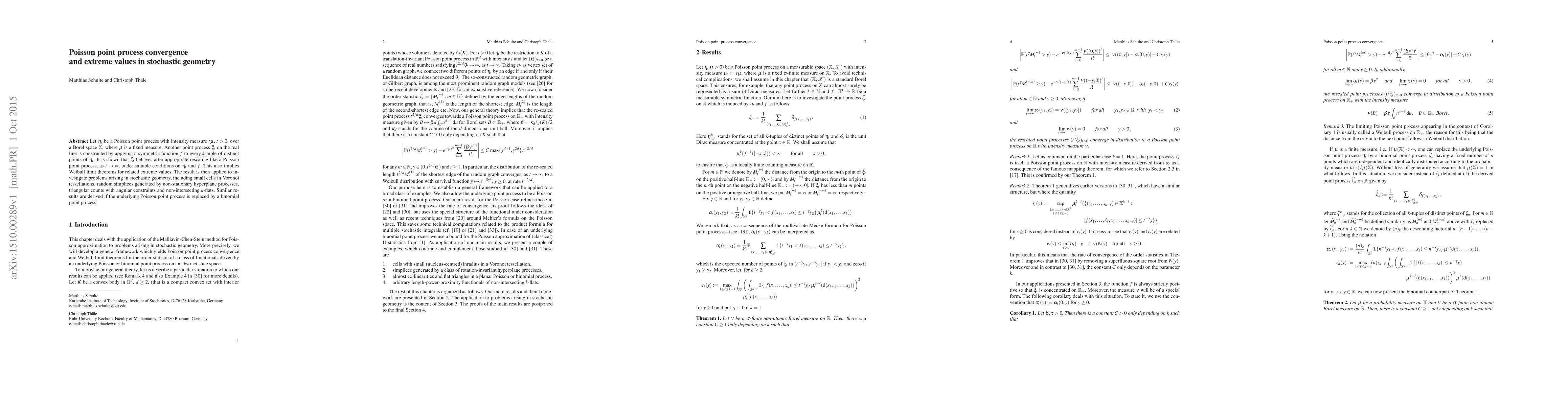 Let $\eta_t$ be a Poisson point process with intensity measure $t\mu$, $t>0$, over a Borel space $\mathbb{X}$, where $\mu$ is a fixed measure. Another point process $\xi_t$ on the real line is constructed by applying a symmetric function $f$ to every $k$-tuple of distinct points of $\eta_t$. It is shown that $\xi_t$ behaves after appropriate rescaling like a Poisson point process, as $t\to\infty$, under suitable conditions on $\eta_t$ and $f$. This also implies Weibull limit theorems for related extreme values. The result is then applied to investigate problems arising in stochastic geometry, including small cells in Voronoi tessellations, random simplices generated by non-stationary hyperplane processes, triangular counts with angular constraints and non-intersecting $k$-flats. Similar results are derived if the underlying Poisson point process is replaced by a binomial point process.