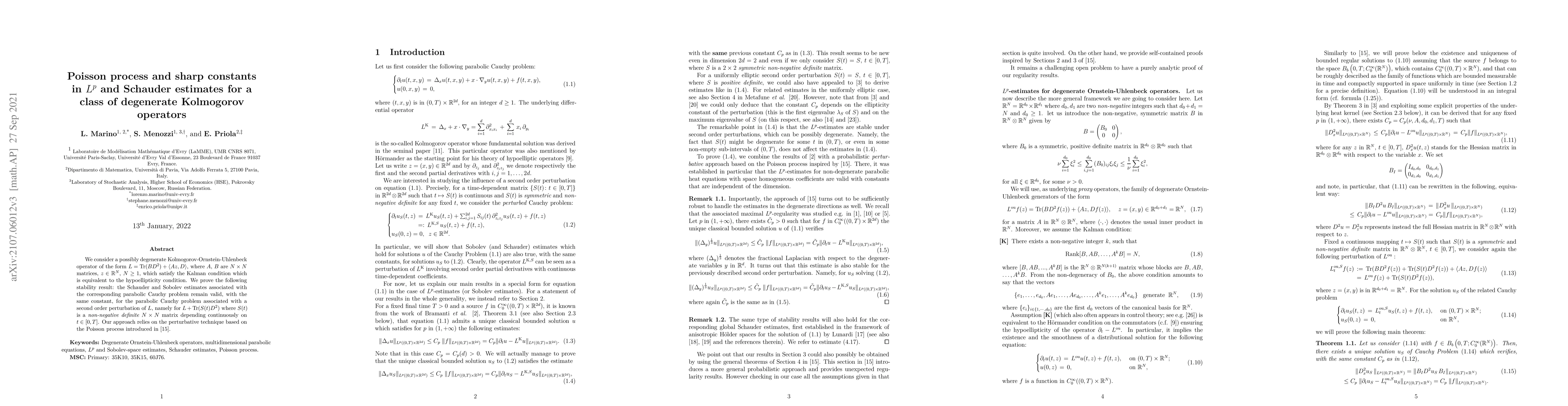 We consider a possibly degenerate Kolmogorov-Ornstein-Uhlenbeck operator of the form L = Tr(BD 2) + Az, D , where A, B are N x N matrices, z $\in$ R N , N $\ge$ 1, which satisfy the Kalman condition which is equivalent to the hypoellipticity condition. We prove the following stability result: the Schauder and Sobolev estimates associated with the corresponding parabolic Cauchy problem remain valid, with the same constant, for the parabolic Cauchy problem associated with a second order perturbation of L, namely for L + Tr(S(t)D 2) where S(t) is a non-negative N x N matrix depending continuously on t $\ge$ 0. Our approach relies on the perturbative technique based on the Poisson process introduced in [15].