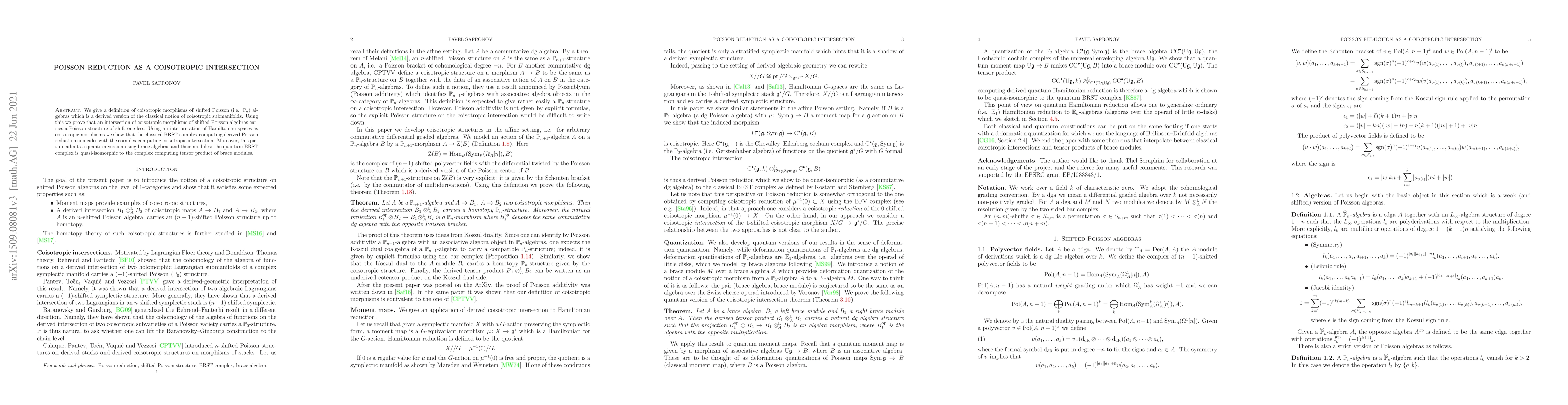 We give a definition of coisotropic morphisms of shifted Poisson (i.e. $P_n$) algebras which is a derived version of the classical notion of coisotropic submanifolds. Using this we prove that an intersection of coisotropic morphisms of shifted Poisson algebras carries a Poisson structure of shift one less. Using an interpretation of Hamiltonian spaces as coisotropic morphisms we show that the classical BRST complex computing derived Poisson reduction coincides with the complex computing coisotropic intersection. Moreover, this picture admits a quantum version using brace algebras and their modules: the quantum BRST complex is quasi-isomorphic to the complex computing tensor product of brace modules.