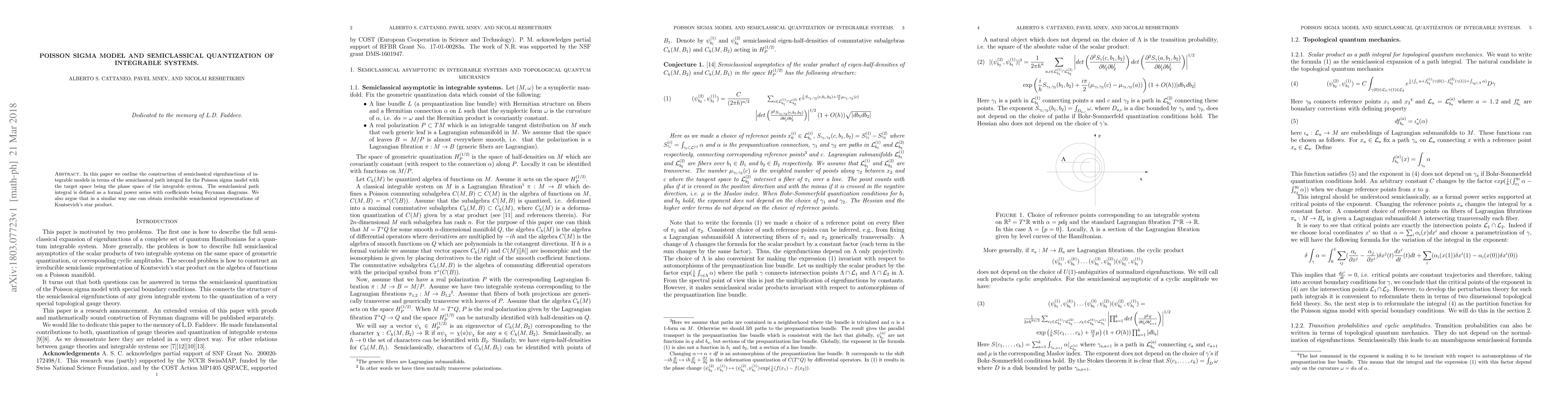 In this paper we outline the construction of semiclassical eigenfunctions of integrable models in terms of the semiclassical path integral for the Poisson sigma model with the target space being the phase space of the integrable system. The semiclassical path integral is defined as a formal power series with coefficients being Feynman diagrams. We also argue that in a similar way one can obtain irreducible semiclassical representations of Kontsevich's star product.