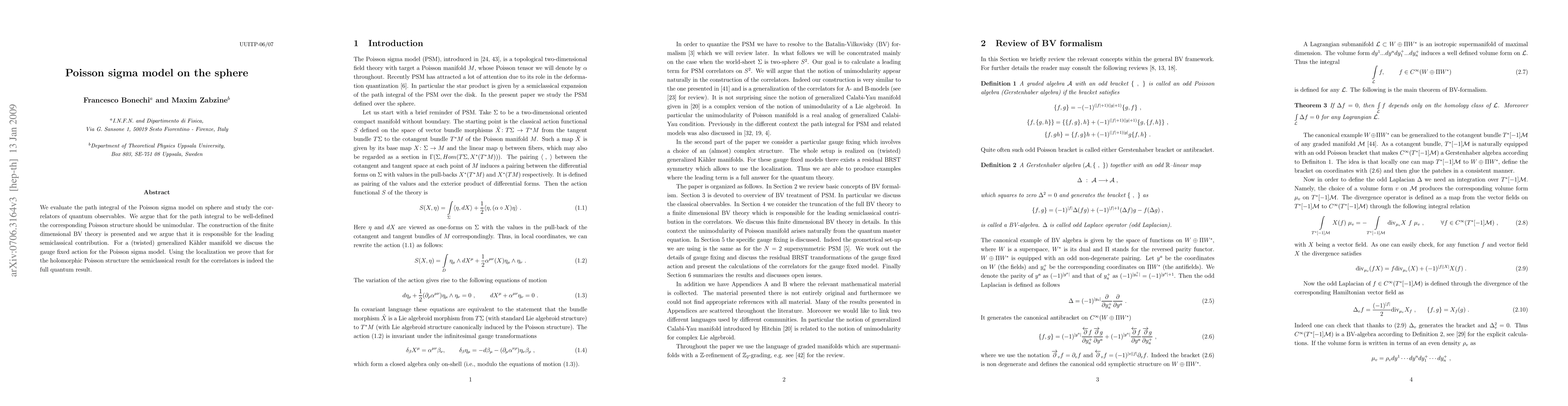 This paper evaluates the path integral of the Poisson sigma model on the sphere and argues that a unimodular Poisson structure is required for a well-defined path integral. It constructs a finite-dimensional BV theory responsible for the leading semiclassical contribution and proves that the semiclassical result for correlators matches the full quantum result for holomorphic Poisson structures.