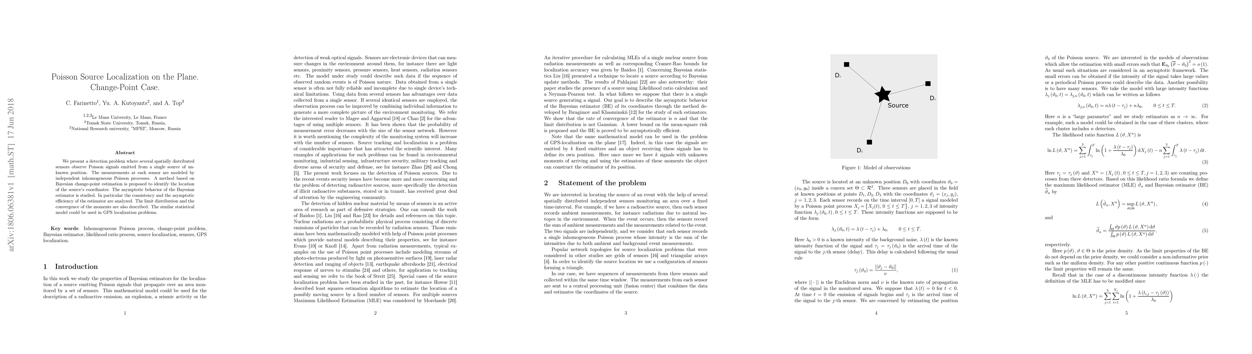 We present a detection problem where several spatially distributed sensors observe Poisson signals emitted from a single source of unknown position. The measurements at each sensor are modeled by independent inhomogeneous Poisson processes. A method based on Bayesian change-point estimation is proposed to identify the location of the source's coordinates. The asymptotic behavior of the Bayesian estimator is studied. In particular the consistency and the asymptotic efficiency of the estimator are shown. The limit distribution and the convergence of the moments are also described. The similar statistical model could be used in GPS localization problems.