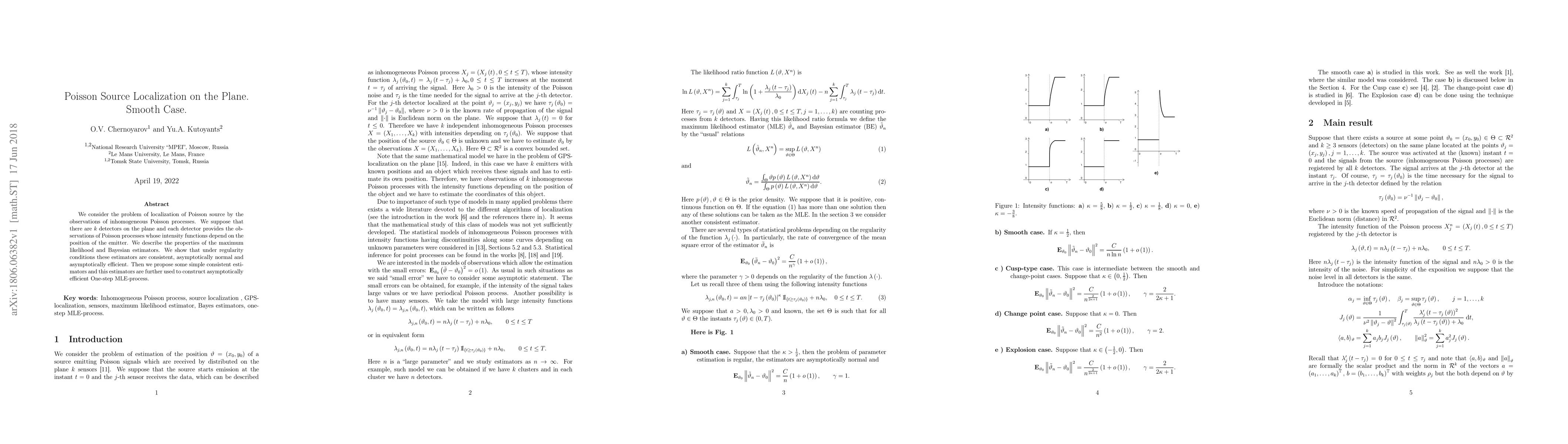 Researchers developed consistent estimators for locating a Poisson source on a plane using detectors with inhomogeneous Poisson processes. Their methods showed consistency, asymptotic normality, and efficiency under regular conditions.