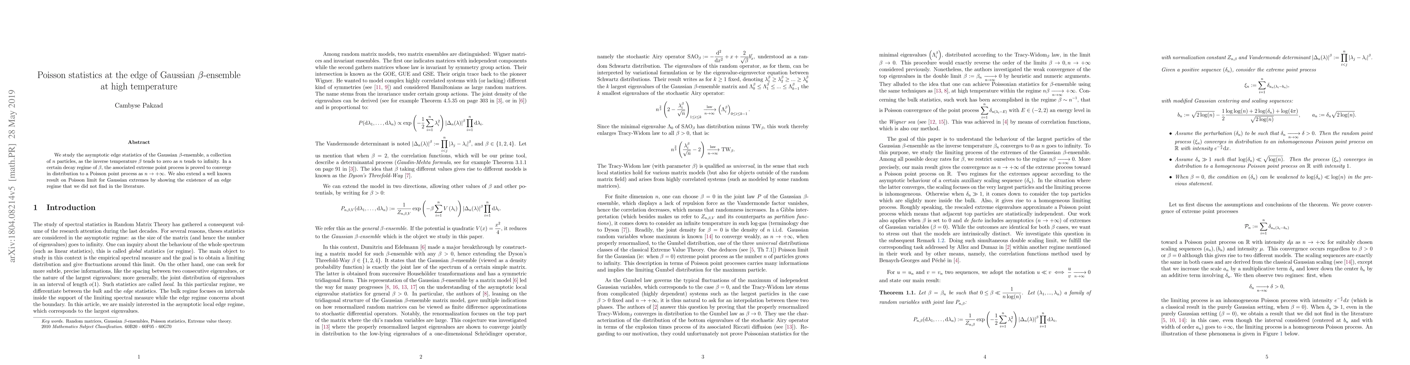 This paper investigates the asymptotic edge statistics of the Gaussian $\beta$-ensemble as $\beta$ approaches zero with $n$ tending to infinity, proving that the extreme point process converges to a Poisson point process. Additionally, it uncovers an unreported edge regime contributing to the Poisson limit of Gaussian extremes.