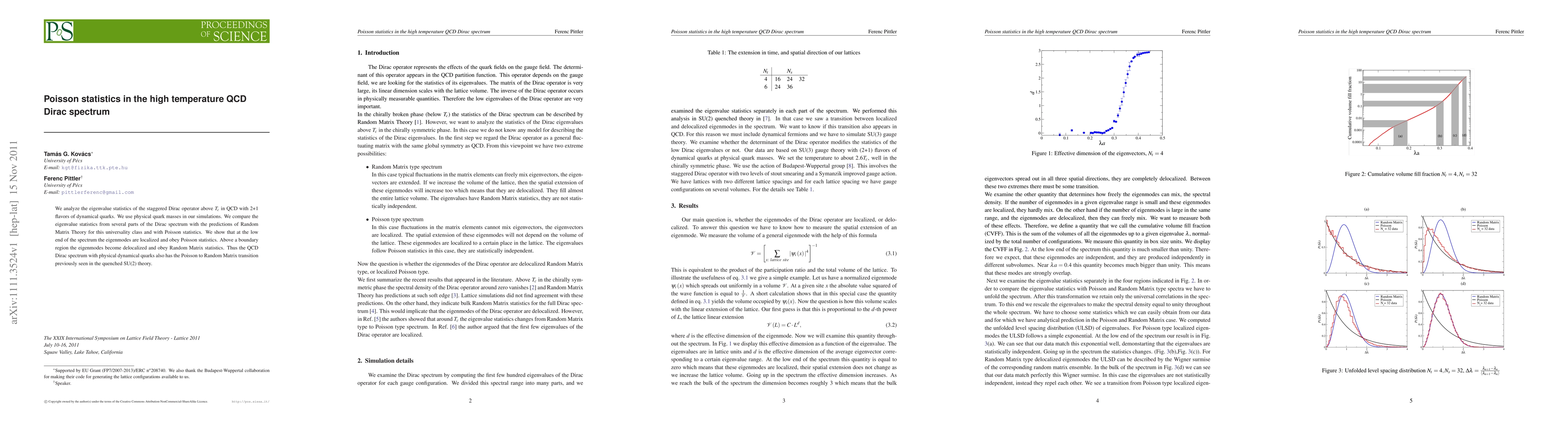 This paper investigates the eigenvalue statistics of the staggered Dirac operator in high-temperature QCD with 2+1 flavors of dynamical quarks, revealing a transition from Poisson to Random Matrix statistics as one moves from the low to high end of the spectrum. The findings mirror the transition observed in quenched SU(2) theory.
