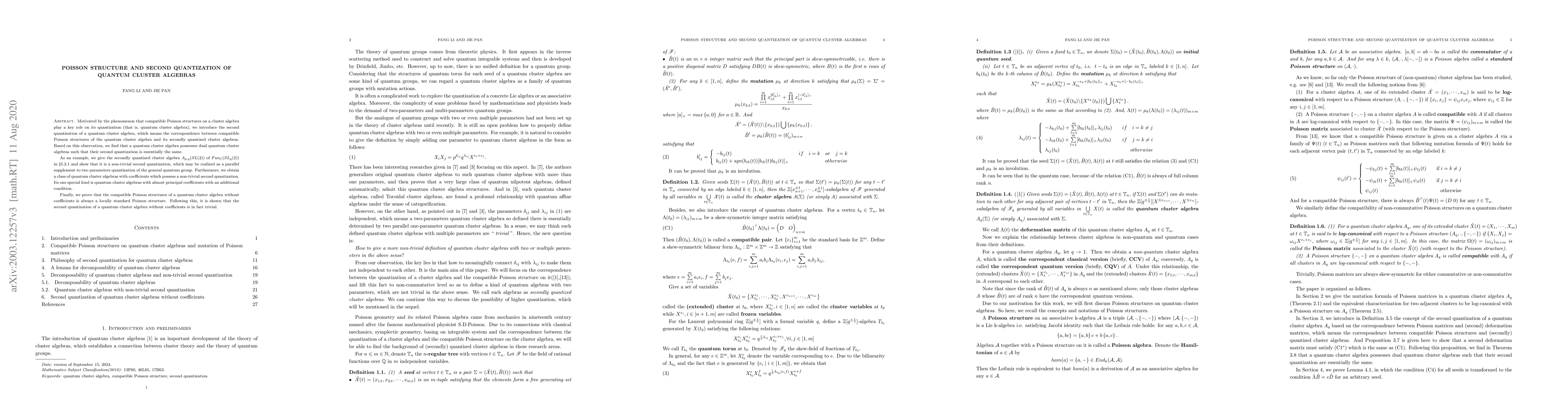 This paper explores the second quantization of quantum cluster algebras and the relationship between compatible Poisson structures on these algebras and their quantized counterparts. It demonstrates that quantum cluster algebras possess dual quantum cluster algebras with identical second quantization, providing a non-trivial example with $A_{p,q}(SL(2))$, and concludes with the finding that second quantization of quantum cluster algebras without coefficients is trivial.