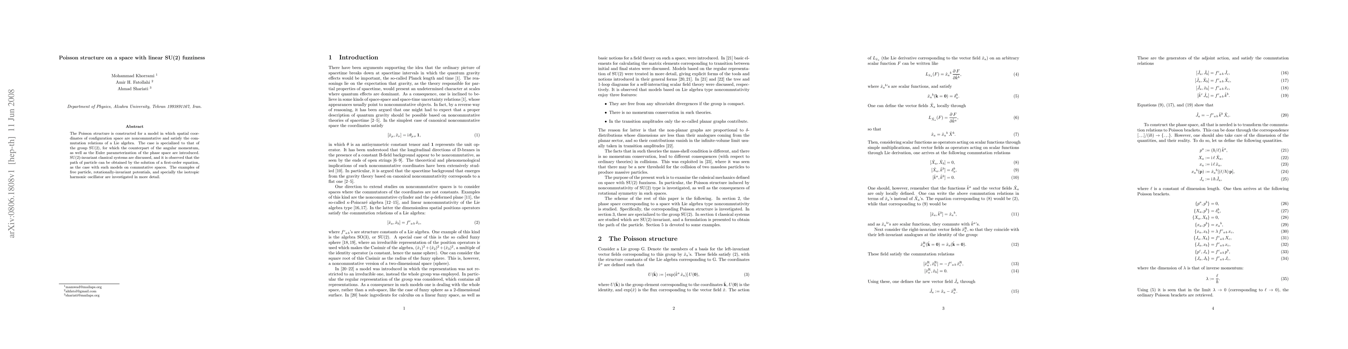 This paper constructs a Poisson structure for a noncommutative spatial configuration space, specifically using the Lie algebra of SU(2). It explores SU(2)-invariant classical systems, finding that particle paths solve first-order equations. The research examines free particles, rotationally-invariant potentials, and the isotropic harmonic oscillator as examples.