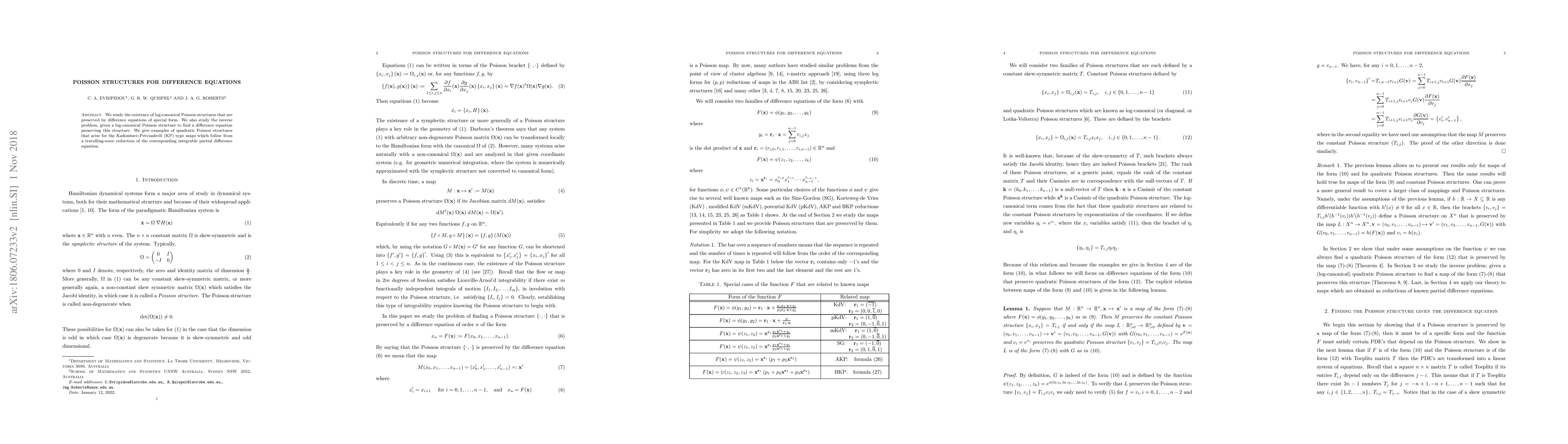 This paper investigates log-canonical Poisson structures preserved by specific difference equations and explores the inverse problem of finding such equations given a structure. It provides examples of quadratic Poisson structures from Kadomtsev-Petviashvili type maps derived via travelling-wave reductions of integrable partial difference equations.