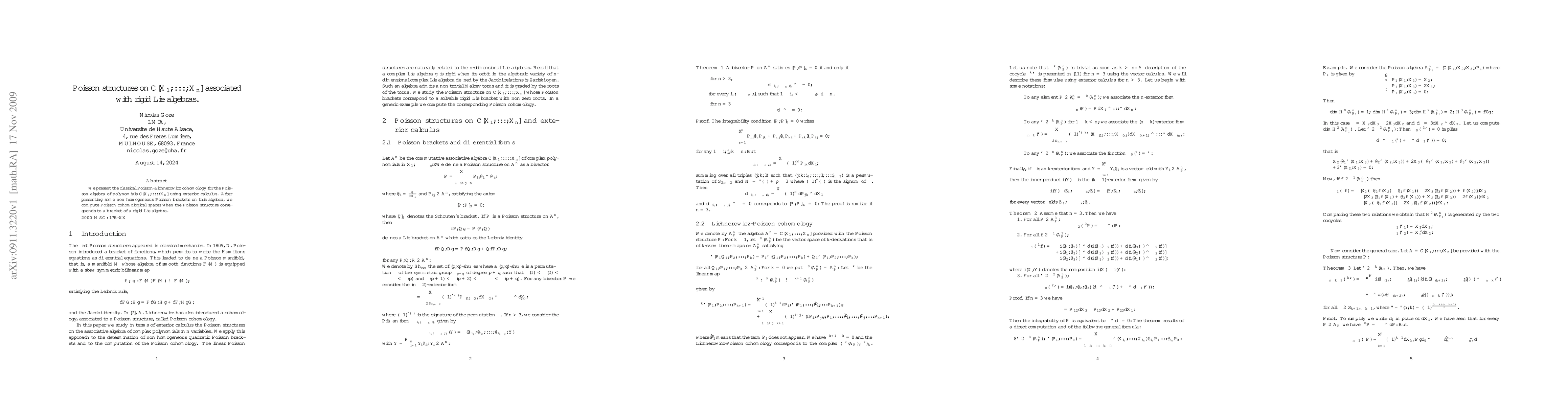 We present the classical Poisson-Lichnerowicz cohomology for the Poisson algebra of polynomials $\mathbb{C}[X_{1},..., X_{n}]$ using exterior calculus. After presenting some non homogeneous Poisson brackets on this algebra, we compute Poisson cohomological spaces when the Poisson structure corresponds to a bracket of a rigid Lie algebra.