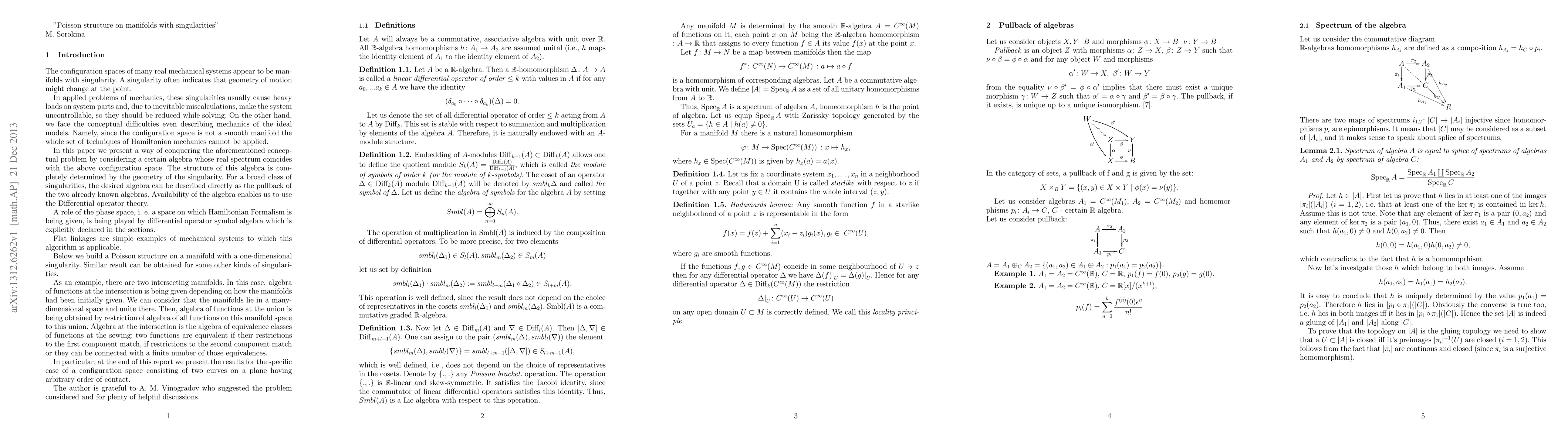 Configuration spaces of many real mechanical systems appear to be manifolds with singularity. A singularity often indicates that geometry of motion may change at the singular point of configuration space. We face conceptual problem describing even mechanics of ideal models since the configuration space is not a smooth manifold, thus, the fully developed means of Hamiltonian Mechanics cannot be applied. In this report we present a way of conquering the aforementioned conceptual problem by considering a certain algebra instead of the configuration space. In this approach configuration space is the real spectrum of the algebra. The structure of this algebra is completely determined by the geometry of the singularity. For a broad class of singularities the desired algebra can be described directly since it is the pullback of two already known algebras. Availability of the algebra enables to use Differential Operator Theory. The elementary examples of mechanical systems to which this algorithm is applicable are flat linkages. In the frames of the presented approach we build a Poisson structure on a manifold with a one-dimensional singularity. The same result can be obtained to some other kinds of singularities. For instance,at the end the we give some specific results for the case of configuration space consisting of two curves on the plane with arbitrary order of contact at the intersection point.