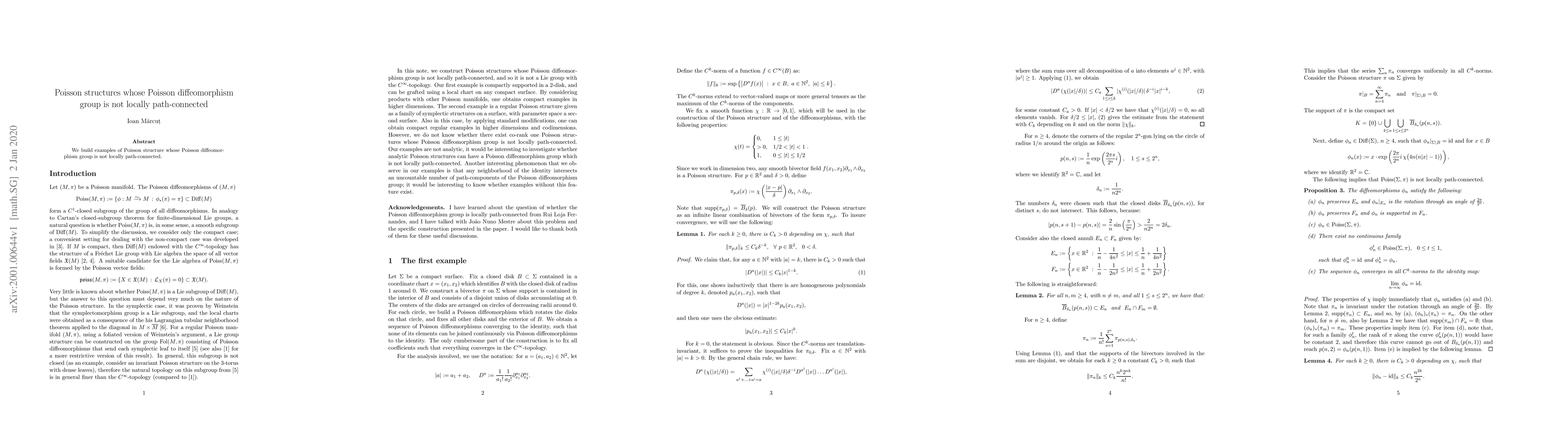We build examples of Poisson structure whose Poisson diffeomorphism group is not locally path-connected.