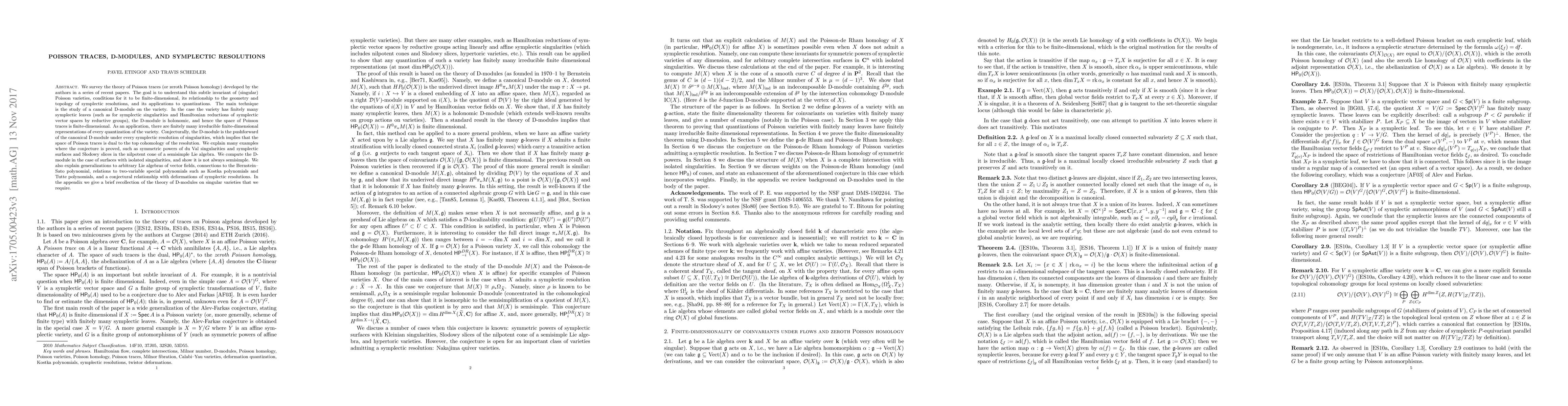 This paper surveys the theory of Poisson traces, focusing on their finite-dimensionality and connections to symplectic resolutions. The authors use D-modules to understand this invariant, proving conjectures for specific examples and showing that the space of Poisson traces is dual to the top cohomology of symplectic resolutions.