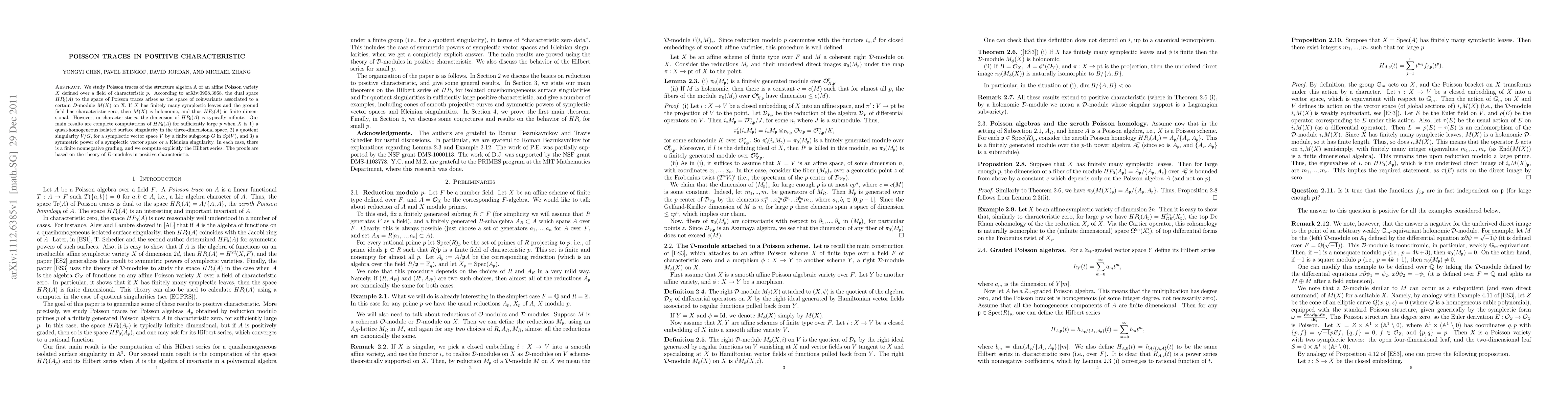 We study Poisson traces of the structure algebra A of an affine Poisson variety X defined over a field of characteristic p. According to arXiv:0908.3868v4, the dual space HP_0(A) to the space of Poisson traces arises as the space of coinvariants associated to a certain D-module M(X) on X. If X has finitely many symplectic leaves and the ground field has characteristic zero, then M(X) is holonomic, and thus HP_0(A) is finite dimensional. However, in characteristic p, the dimension of HP_0(A) is typically infinite. Our main results are complete computations of HP_0(A) for sufficiently large p when X is 1) a quasi-homogeneous isolated surface singularity in the three-dimensional space, 2) a quotient singularity V/G, for a symplectic vector space V by a finite subgroup G in Sp(V), and 3) a symmetric power of a symplectic vector space or a Kleinian singularity. In each case, there is a finite nonnegative grading, and we compute explicitly the Hilbert series. The proofs are based on the theory of D-modules in positive characteristic.