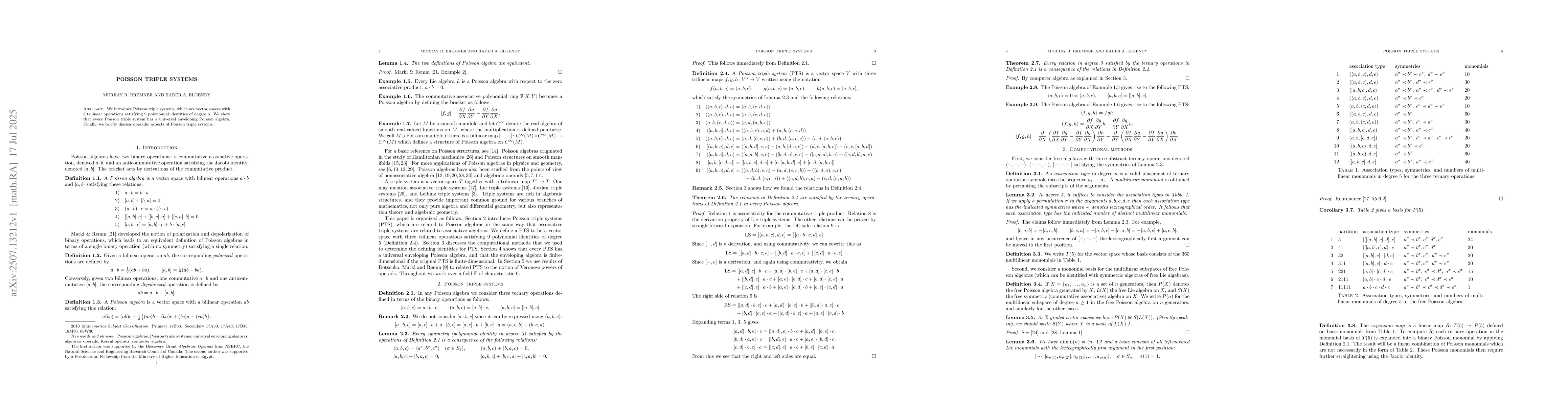 The research introduces Poisson triple systems, defined as vector spaces with three trilinear operations satisfying specific polynomial identities of degree 5. It uses free algebras, association types, and computational methods to analyze these systems.