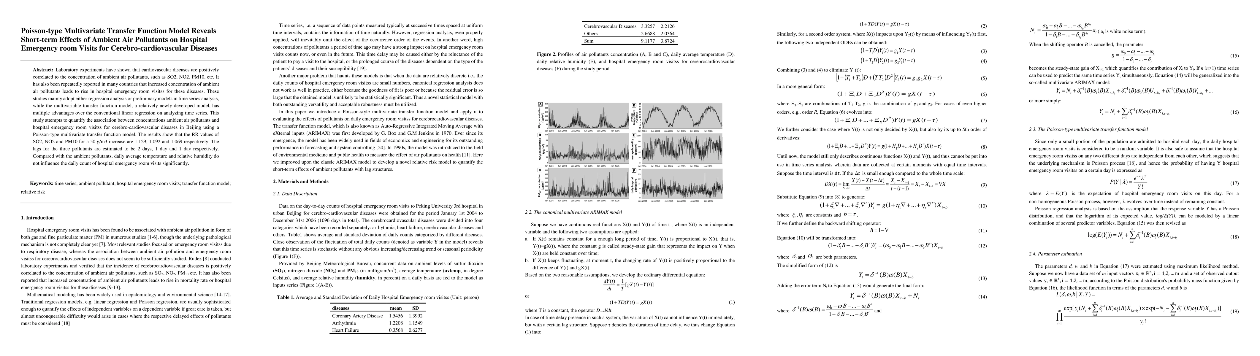Laboratory experiments have shown that cardiovascular diseases are positively correlated to the concentration of ambient air pollutants, such as SO2, NO2, PM10, etc. It has also been repeatedly reported in many countries that increased concentration of ambient air pollutants leads to rise in hospital emergency room visitss for these diseases. These studies mainly adopt either regression analysis or preliminary models in time series analysis, while the multivariable transfer function model, a relatively newly developed model, has multiple advantages over the conventional linear regression on analyzing time series. This study attempts to quantify the association between concentrations ambient air pollutants and hospital emergency room visitss for cerebro-cardiovascular diseases in Beijing using a Poisson-type multivariate transfer function model. The results show that the RR values of SO2, NO2 and PM10 for a 50 g/m3 increase are 1.129, 1.092 and 1.069 respectively. The lags for the three pollutants are estimated to be 2 days, 1 day and 1 day respectively. Compared with the ambient pollutants, daily average temperature and relative humidity do not influence the daily count of hospital emergency room visits significantly.