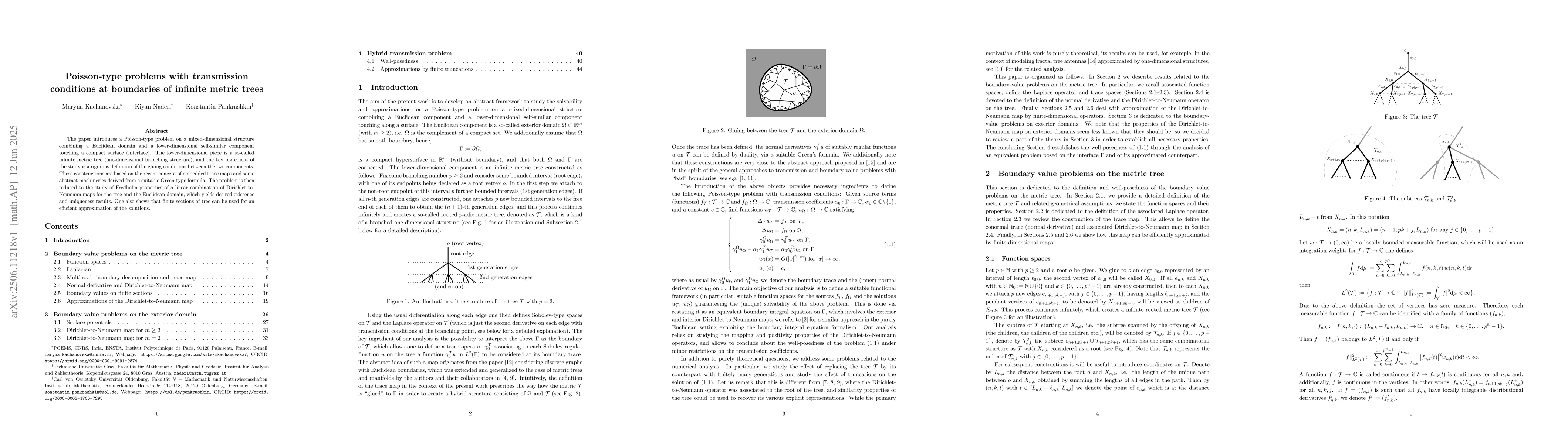 This research paper presents a Poisson-type problem solution on a mixed-dimensional structure, merging a Euclidean space with an infinite metric tree. It defines rigorous gluing conditions using embedded trace maps and Green-type formulas, leading to existence and uniqueness results. The study also suggests using finite sections of the tree for efficient solution approximations.