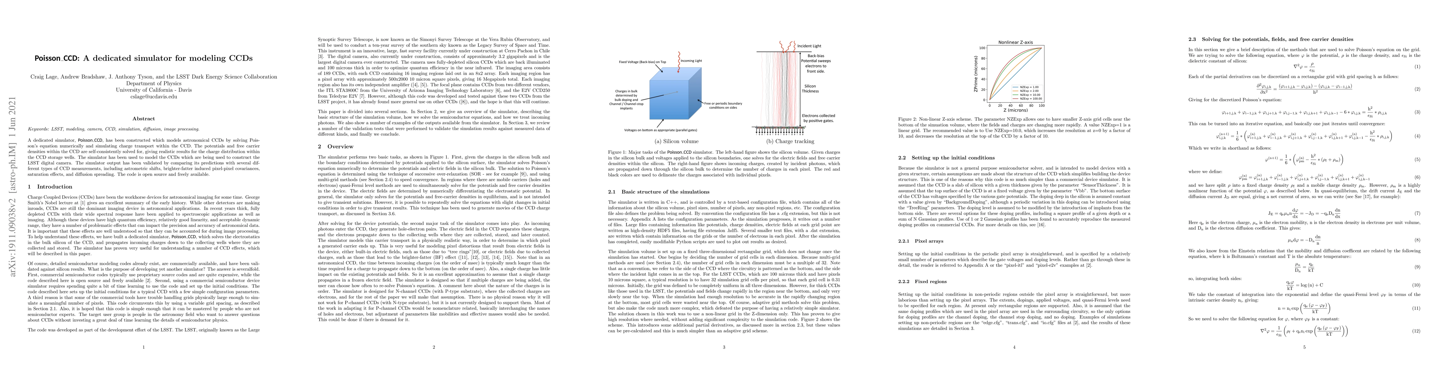 A dedicated simulator, Poisson_CCD, has been constructed which models astronomical CCDs by solving Poisson's equation numerically and simulating charge transport within the CCD. The potentials and free carrier densities within the CCD are self-consistently solved for, giving realistic results for the charge distribution within the CCD storage wells. The simulator has been used to model the CCDs which are being used to construct the LSST digital camera. The simulator output has been validated by comparing its predictions with several different types of CCD measurements, including astrometric shifts, brighter-fatter induced pixel-pixel covariances, saturation effects, and diffusion spreading. The code is open source and freely available.