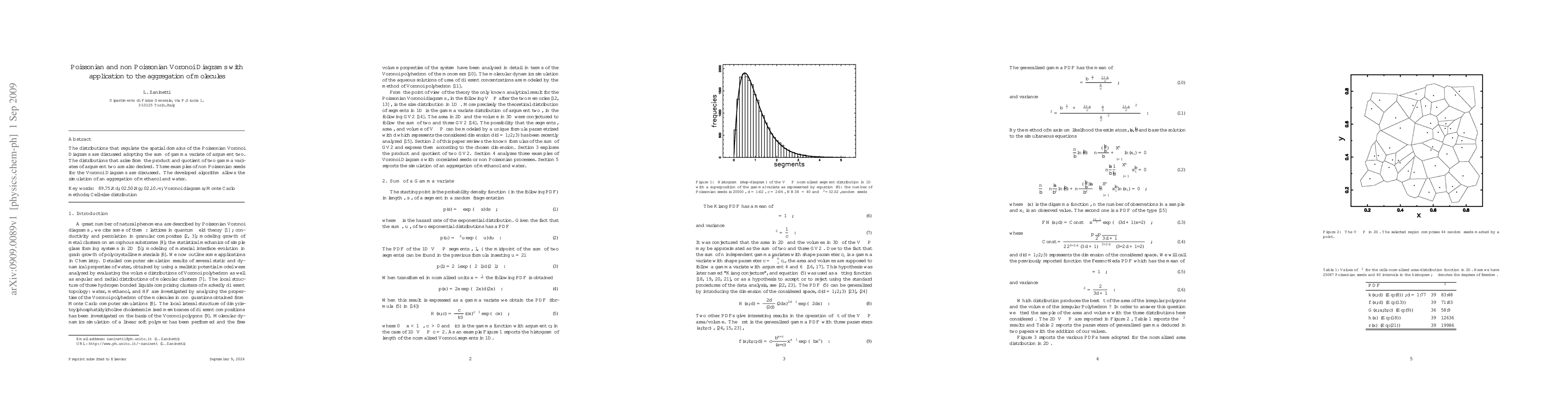 Summary: The paper explores Poissonian and non-Poissonian Voronoi Diagrams, deriving distributions from gamma variates and simulating molecular aggregation, specifically methanol and water, using the developed algorithm.