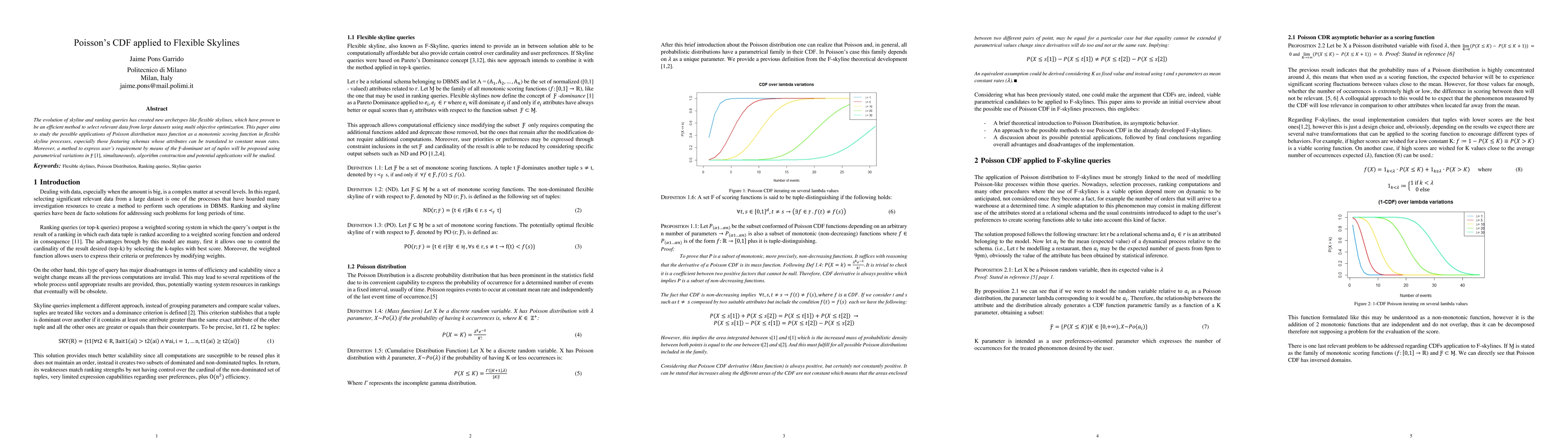 This paper explores applying Poisson's CDF as a monotonic scoring function in flexible skylines, particularly for datasets with attributes that can be translated to constant mean rates. It proposes a method to express users' requirements through F-dominant sets and examines algorithm construction and potential applications.