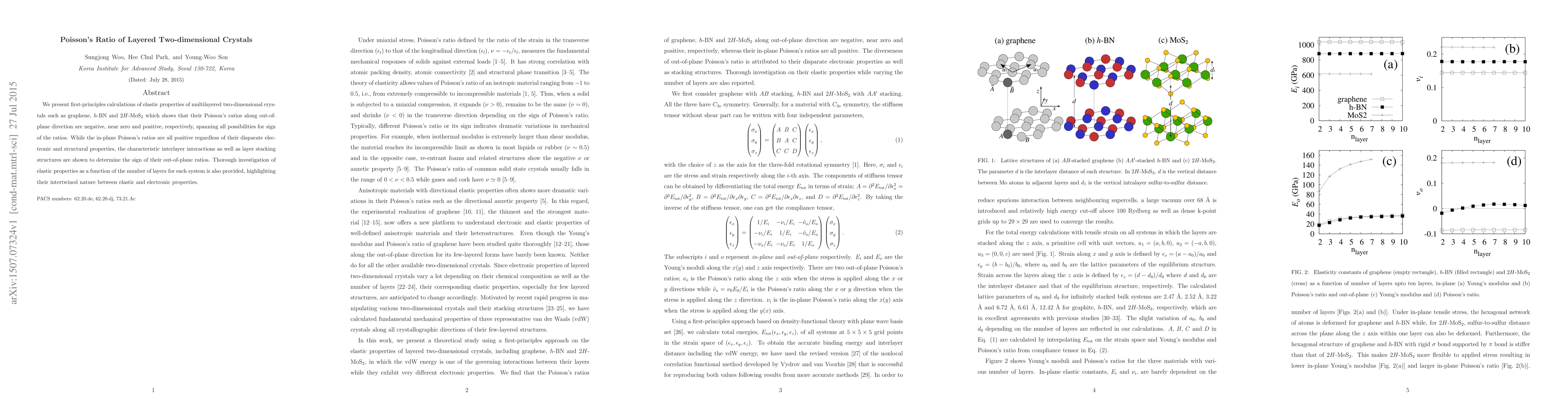 We present first-principles calculations of elastic properties of multilayered two-dimensional crystals such as graphene, h-BN and 2H-MoS2 which shows that their Poisson's ratios along out-of-plane direction are negative, near zero and positive, respectively, spanning all possibilities for sign of the ratios. While the in-plane Poisson's ratios are all positive regardless of their disparate electronic and structural properties, the characteristic interlayer interactions as well as layer stacking structures are shown to determine the sign of their out-of-plane ratios. Thorough investigation of elastic properties as a function of the number of layers for each system is also provided, highlighting their intertwined nature between elastic and electronic properties.