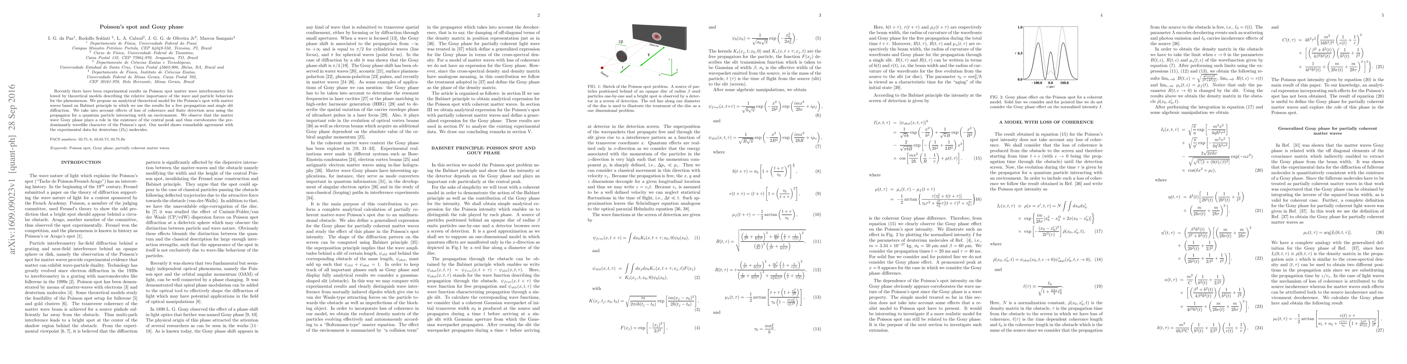 Recently there have been experimental results on Poisson spot matter wave interferometry followed by theoretical models describing the relative importance of the wave and particle behaviors for the phenomenon. We propose an analytical theoretical model for the Poisson's spot with matter waves based on Babinet principle in which we use the results for a free propagation and single slit diffraction. We take into account effects of loss of coherence and finite detection area using the propagator for a quantum particle interacting with an environment. We observe that the matter wave Gouy phase plays a role in the existence of the central peak and thus corroborates the predominantly wavelike character of the Poisson's spot. Our model shows remarkable agreement with the experimental data for deuterium ($D_{2}$) molecules.
