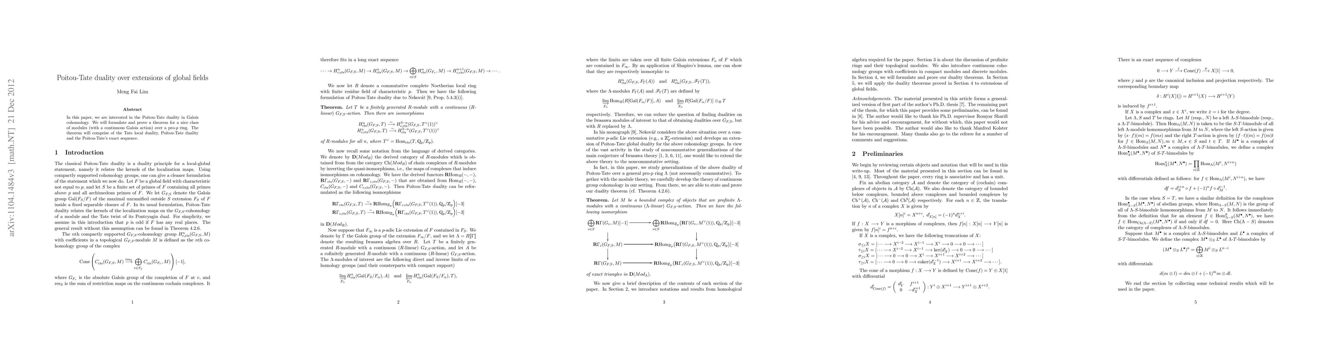 Summary: This paper establishes a derived category version of Poitou-Tate duality for Galois cohomology of compact modules with continuous Galois action over a pro-p ring, extending classical duality theory to more complex algebraic structures.