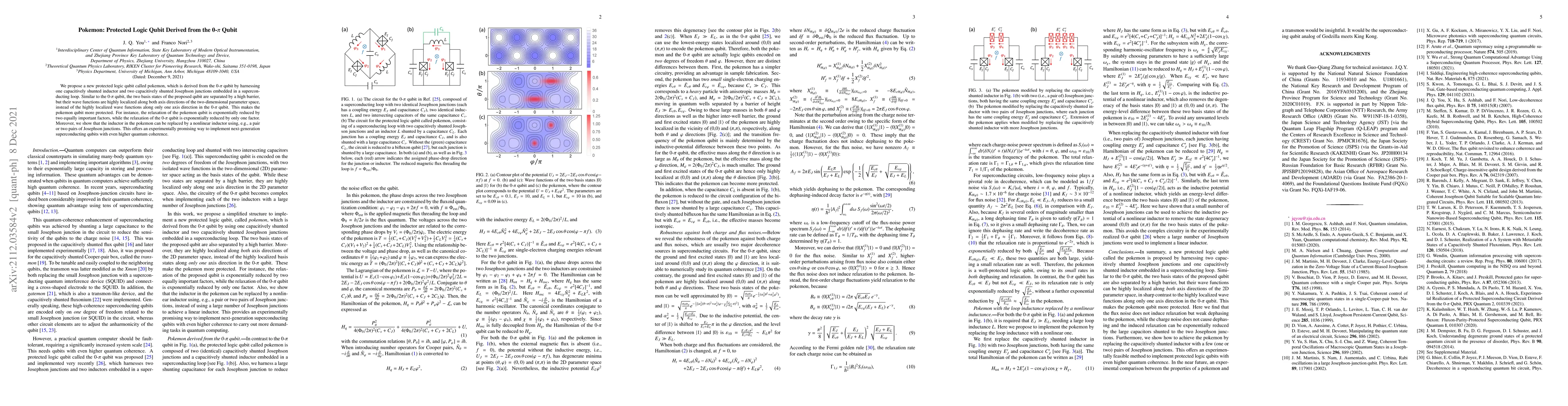 The paper proposes a new protected logic qubit called pokemon, derived from the 0-$\pi$ qubit, featuring enhanced protection through highly localized wave functions in a two-dimensional parameter space, leading to exponentially reduced relaxation. It also suggests replacing the inductor with a nonlinear inductor for improved quantum coherence.