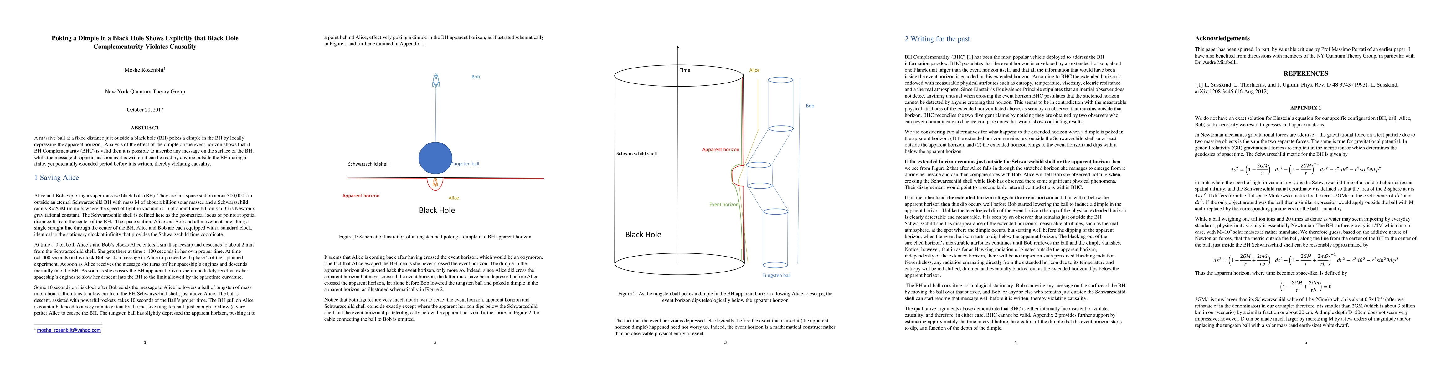 A massive ball at a fixed distance just outside a black hole (BH) pokes a dimple in the BH by locally depressing the apparent horizon. Analysis of the effect of the dimple on the event horizon shows that if BH Complementarity (BHC) is valid then it is possible to inscribe any message on the surface of the BH; while the message disappears as soon as it is written it can be read by anyone outside the BH during a finite, yet potentially extended period before it is written, thereby violating causality.