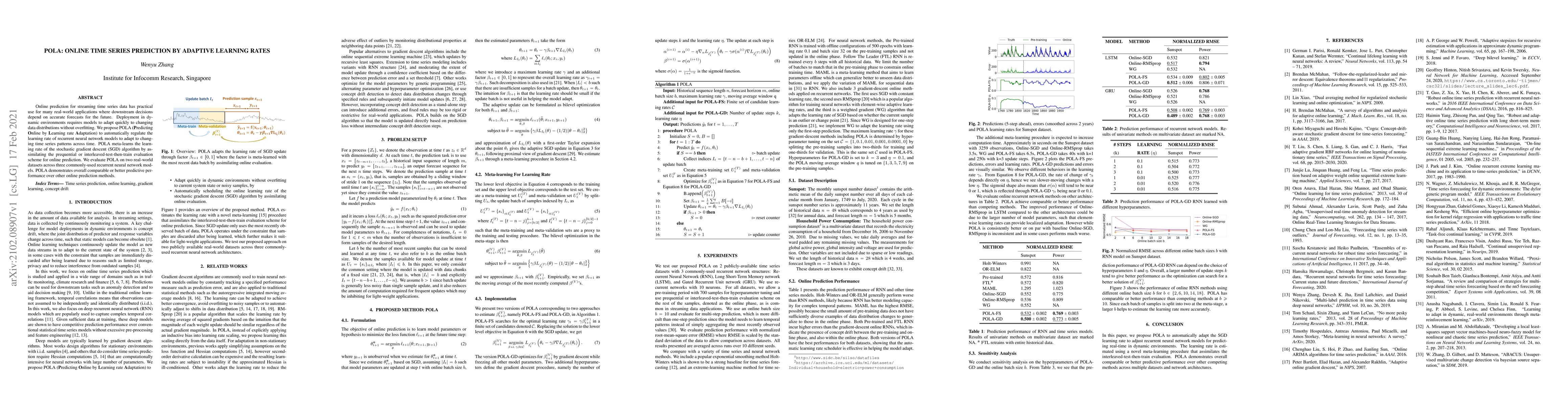 POLA is an adaptive learning rate method for online time series prediction using recurrent neural networks, which meta-learns the learning rate to handle changing data distributions. Evaluated on two datasets, POLA shows comparable or superior performance to other online prediction techniques.