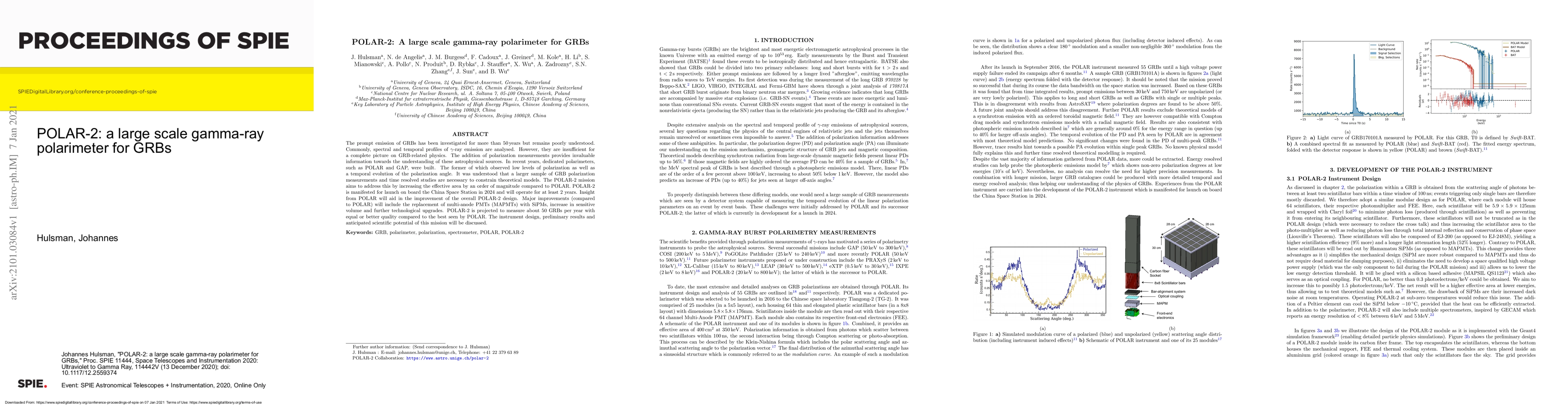 POLAR-2 is a large-scale gamma-ray polarimeter designed to significantly enhance the study of gamma-ray bursts (GRBs) by measuring their polarization, aiming to provide deeper insights into their physical processes. The mission, set to launch in 2024, will increase the effective area and improve detection technology to observe a larger sample of GRBs.