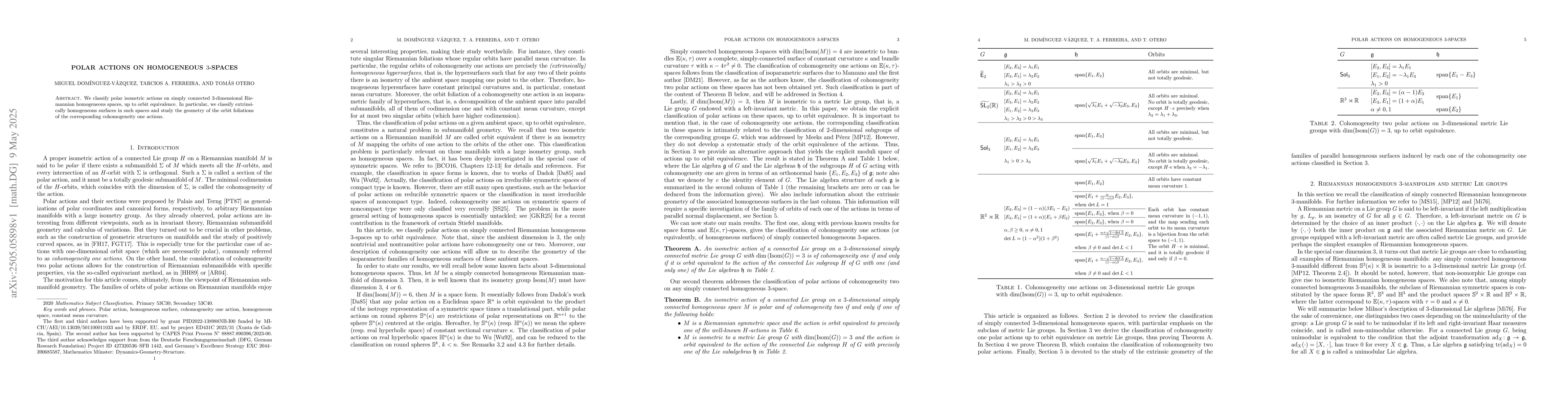 The paper classifies polar isometric actions on simply connected 3D Riemannian homogeneous spaces through orbit equivalence, focusing on cohomogeneity one actions and extrinsically homogeneous surfaces.