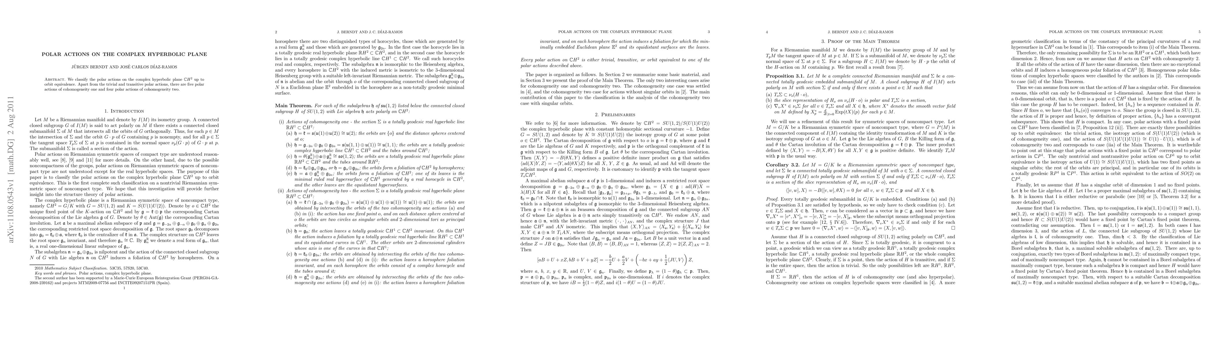 Summary: This paper classifies polar actions on the complex hyperbolic plane, identifying five cohomogeneity one and four cohomogeneity two actions, in addition to trivial and transitive actions. The focus is on orbit equivalence.