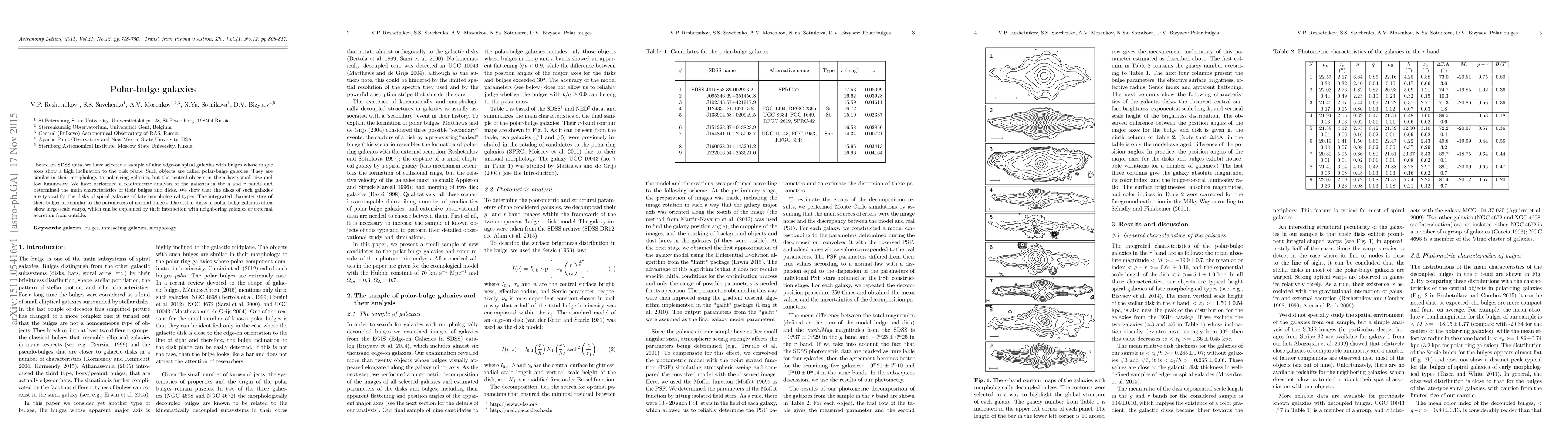 Based on SDSS data, we have selected a sample of nine edge-on spiral galaxies with bulges whose major axes show a high inclination to the disk plane. Such objects are called polar-bulge galaxies. They are similar in their morphology to polar-ring galaxies, but the central objects in them have small size and low luminosity. We have performed a photometric analysis of the galaxies in the g and r bands and determined the main characteristics of their bulges and disks. We show that the disks of such galaxies are typical for the disks of spiral galaxies of late morphological types. The integrated characteristics of their bulges are similar to the parameters of normal bulges. The stellar disks of polar-bulge galaxies often show large-scale warps, which can be explained by their interaction with neighboring galaxies or external accretion from outside.