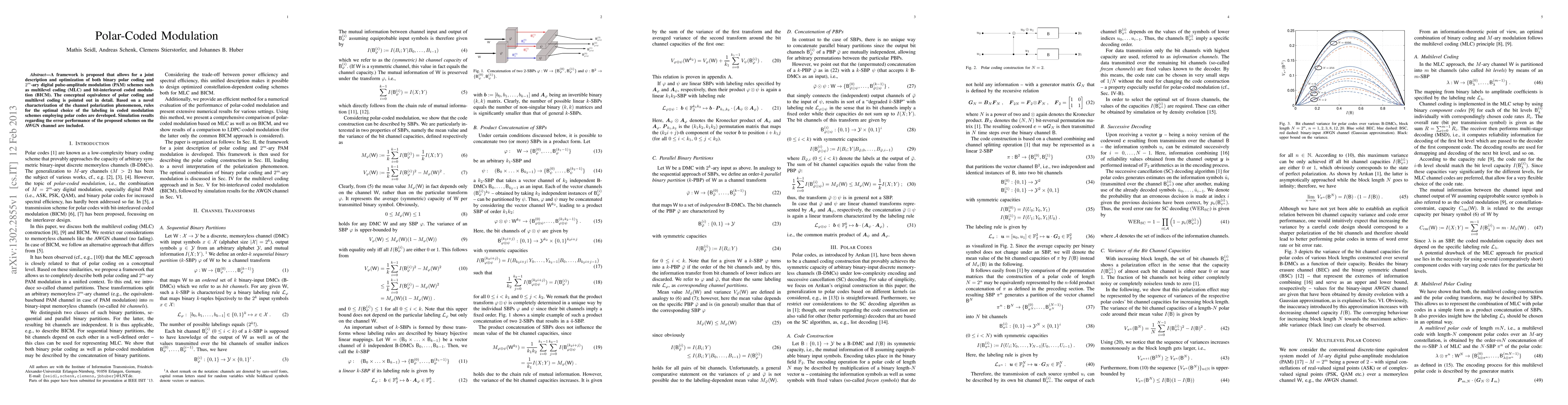 A framework is proposed that allows for a joint description and optimization of both binary polar coding and $2^m$-ary digital pulse-amplitude modulation (PAM) schemes such as multilevel coding (MLC) and bit-interleaved coded modulation (BICM). The conceptual equivalence of polar coding and multilevel coding is pointed out in detail. Based on a novel characterization of the channel polarization phenomenon, rules for the optimal choice of the labeling in coded modulation schemes employing polar codes are developed. Simulation results regarding the error performance of the proposed schemes on the AWGN channel are included.