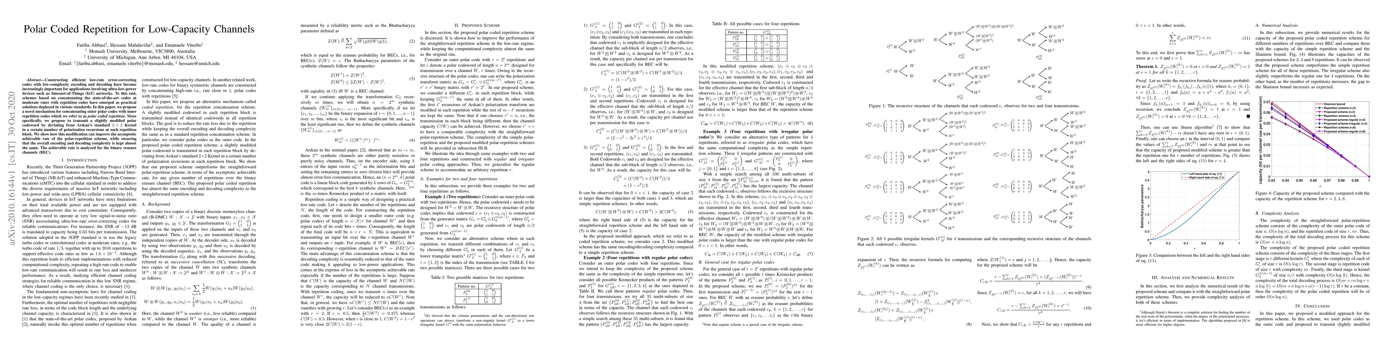 Constructing efficient low-rate error-correcting codes with low-complexity encoding and decoding have become increasingly important for applications involving ultra-low-power devices such as Internet-of-Things (IoT) networks. To this end, schemes based on concatenating the state-of-the-art codes at moderate rates with repetition codes have emerged as practical solutions deployed in various standards. In this paper, we propose a novel mechanism for concatenating outer polar codes with inner repetition codes which we refer to as polar coded repetition. More specifically, we propose to transmit a slightly modified polar codeword by deviating from Arikan's standard 2 x 2 Kernel in a certain number of polarization recursions at each repetition block. We show how this modification can improve the asymptotic achievable rate of the polar-repetition scheme, while ensuring that the overall encoding and decoding complexity is kept almost the same. The achievable rate is analyzed for the binary erasure channels (BEC).