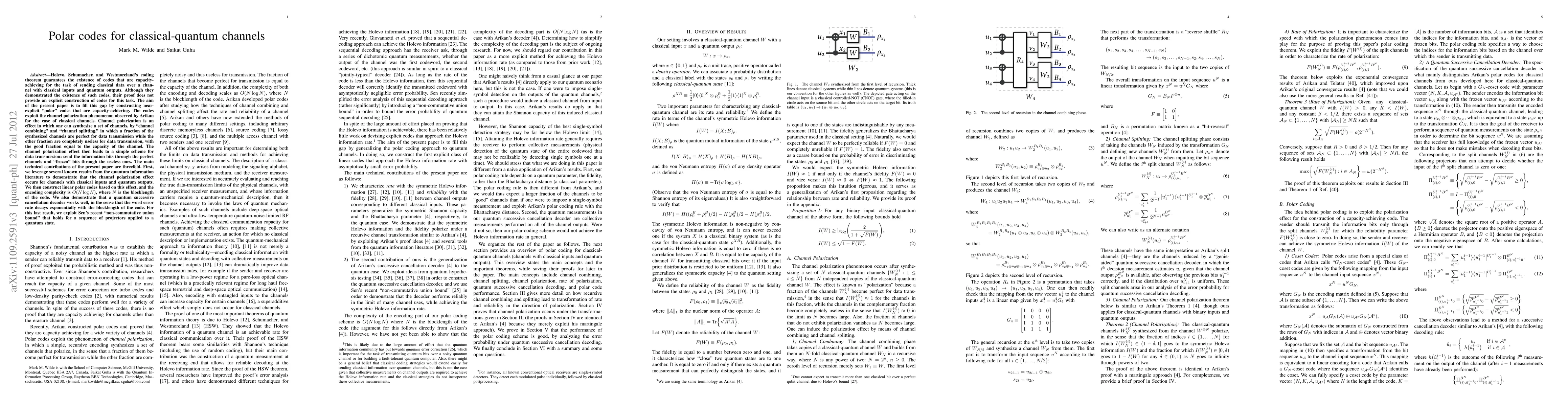 Holevo, Schumacher, and Westmoreland's coding theorem guarantees the existence of codes that are capacity-achieving for the task of sending classical data over a channel with classical inputs and quantum outputs. Although they demonstrated the existence of such codes, their proof does not provide an explicit construction of codes for this task. The aim of the present paper is to fill this gap by constructing near-explicit "polar" codes that are capacity-achieving. The codes exploit the channel polarization phenomenon observed by Arikan for the case of classical channels. Channel polarization is an effect in which one can synthesize a set of channels, by "channel combining" and "channel splitting," in which a fraction of the synthesized channels are perfect for data transmission while the other fraction are completely useless for data transmission, with the good fraction equal to the capacity of the channel. The channel polarization effect then leads to a simple scheme for data transmission: send the information bits through the perfect channels and "frozen" bits through the useless ones. The main technical contributions of the present paper are threefold. First, we leverage several known results from the quantum information literature to demonstrate that the channel polarization effect occurs for channels with classical inputs and quantum outputs. We then construct linear polar codes based on this effect, and the encoding complexity is O(N log N), where N is the blocklength of the code. We also demonstrate that a quantum successive cancellation decoder works well, in the sense that the word error rate decays exponentially with the blocklength of the code. For this last result, we exploit Sen's recent "non-commutative union bound" that holds for a sequence of projectors applied to a quantum state.