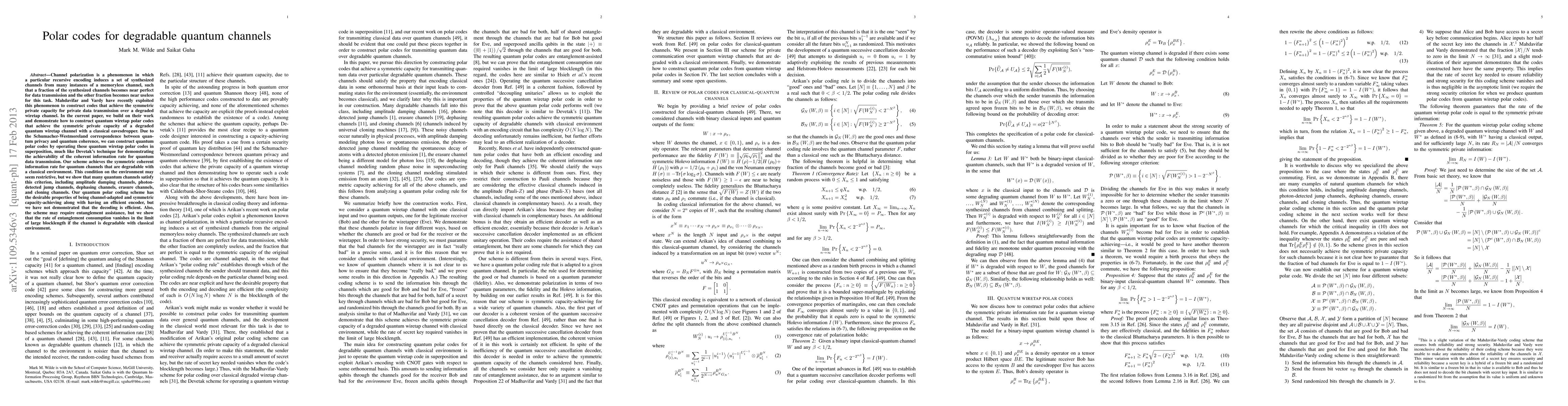 Channel polarization is a phenomenon in which a particular recursive encoding induces a set of synthesized channels from many instances of a memoryless channel, such that a fraction of the synthesized channels becomes near perfect for data transmission and the other fraction becomes near useless for this task. Mahdavifar and Vardy have recently exploited this phenomenon to construct codes that achieve the symmetric private capacity for private data transmission over a degraded wiretap channel. In the current paper, we build on their work and demonstrate how to construct quantum wiretap polar codes that achieve the symmetric private capacity of a degraded quantum wiretap channel with a classical eavesdropper. Due to the Schumacher-Westmoreland correspondence between quantum privacy and quantum coherence, we can construct quantum polar codes by operating these quantum wiretap polar codes in superposition, much like Devetak's technique for demonstrating the achievability of the coherent information rate for quantum data transmission. Our scheme achieves the symmetric coherent information rate for quantum channels that are degradable with a classical environment. This condition on the environment may seem restrictive, but we show that many quantum channels satisfy this criterion, including amplitude damping channels, photon-detected jump channels, dephasing channels, erasure channels, and cloning channels. Our quantum polar coding scheme has the desirable properties of being channel-adapted and symmetric capacity-achieving along with having an efficient encoder, but we have not demonstrated that the decoding is efficient. Also, the scheme may require entanglement assistance, but we show that the rate of entanglement consumption vanishes in the limit of large blocklength if the channel is degradable with classical environment.
