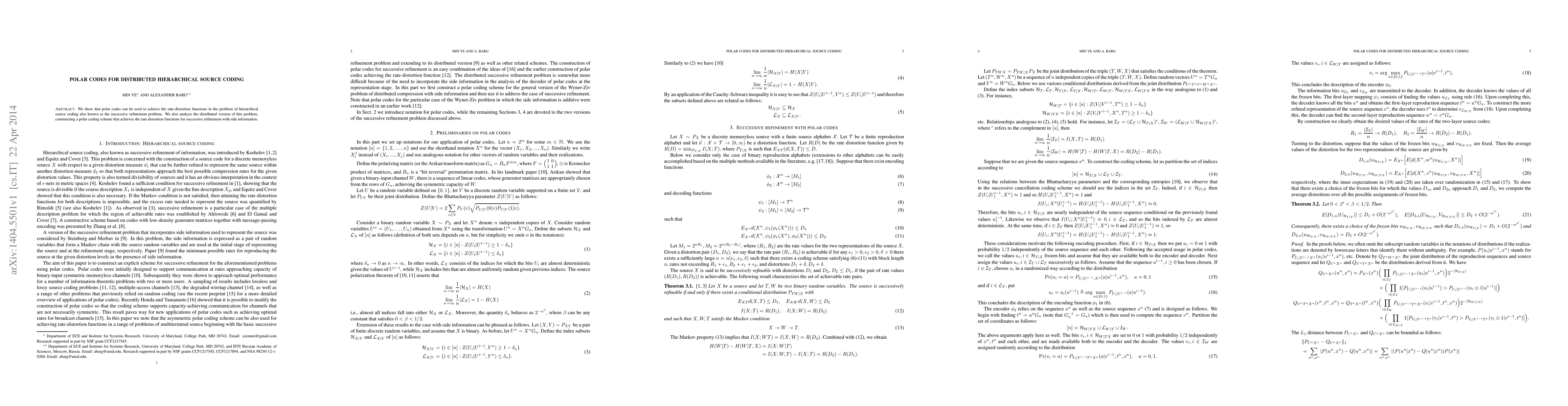 Summary: This paper demonstrates the application of polar codes to achieve rate-distortion functions in hierarchical source coding, and constructs a polar coding scheme for the distributed version, achieving rate distortion functions with side information.