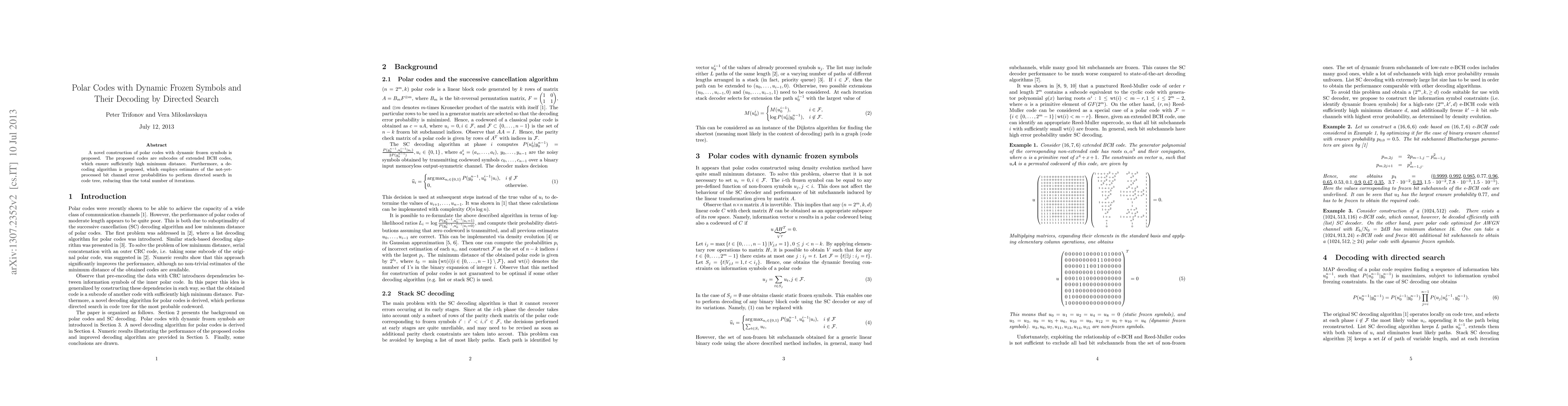 A novel construction of polar codes with dynamic frozen symbols is proposed. The proposed codes are subcodes of extended BCH codes, which ensure sufficiently high minimum distance. Furthermore, a decoding algorithm is proposed, which employs estimates of the not-yet-processed bit channel error probabilities to perform directed search in code tree, reducing thus the total number of iterations.