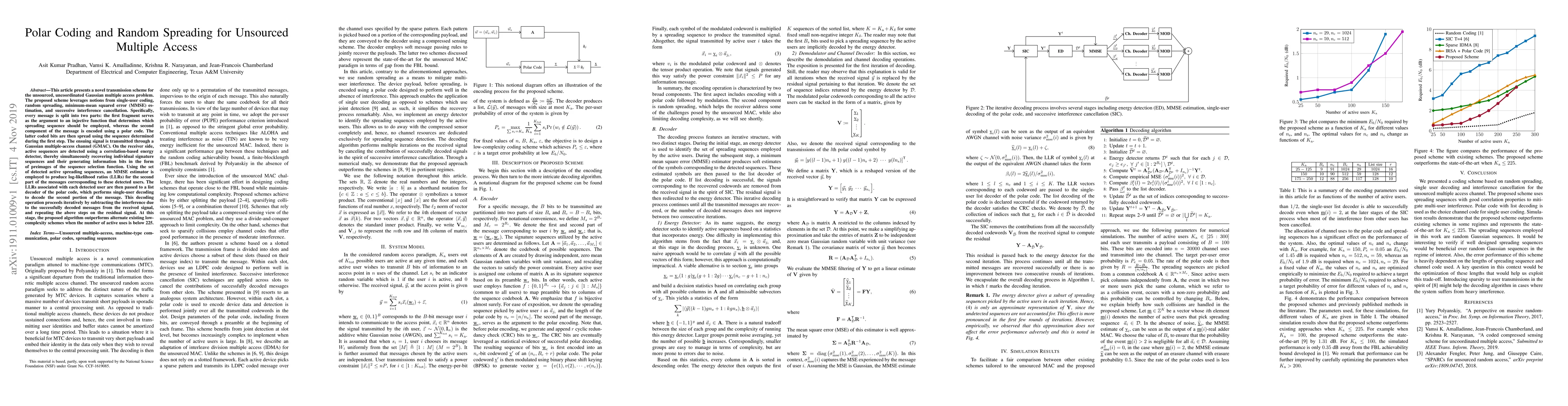 This article presents a novel transmission scheme for the unsourced, uncoordinated Gaussian multiple access problem. The proposed scheme leverages notions from single-user coding, random spreading, minimum-mean squared error (MMSE) estimation, and successive interference cancellation. Specifically, every message is split into two parts: the first fragment serves as the argument to an injective function that determines which spreading sequence should be employed, whereas the second component of the message is encoded using a polar code. The latter coded bits are then spread using the sequence determined during the first step. The ensuing signal is transmitted through a Gaussian multiple-access channel (GMAC). On the receiver side, active sequences are detected using a correlation-based energy detector, thereby simultaneously recovering individual signature sequences and their generating information bits in the form of preimages of the sequence selection function. Using the set of detected active spreading sequences, an MMSE estimator is employed to produce log-likelihood ratios (LLRs) for the second part of the messages corresponding to these detected users. The LLRs associated with each detected user are then passed to a list decoder of the polar code, which performs single-user decoding to decode the second portion of the message. This decoding operation proceeds iteratively by subtracting the interference due to the successfully decoded messages from the received signal, and repeating the above steps on the residual signal. At this stage, the proposed algorithm outperforms alternate existing low-complexity schemes when the number of active uses is below 225.
