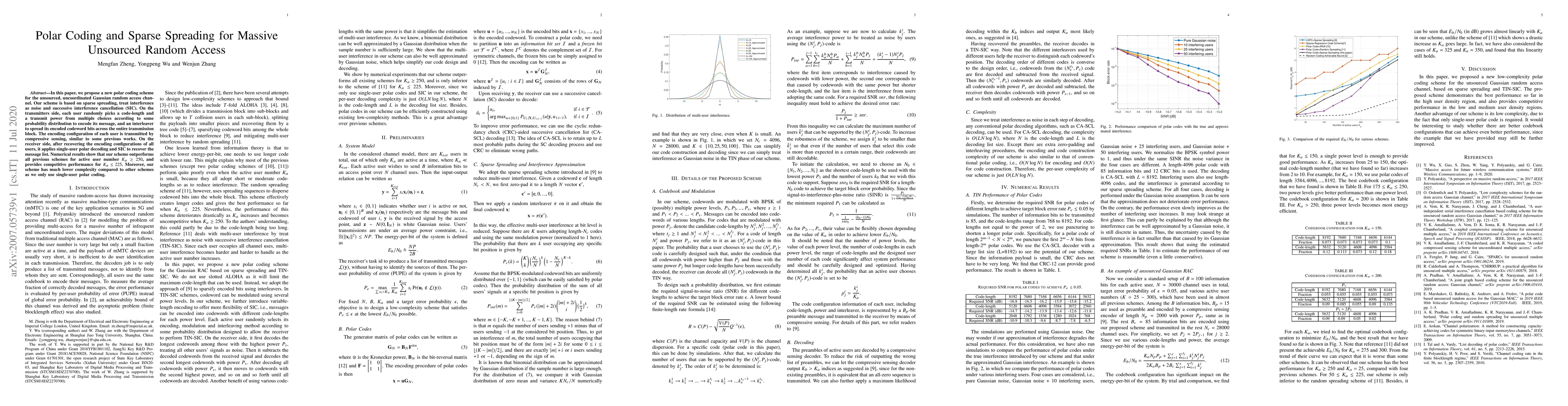 The paper proposes a polar coding scheme for unsourced, uncoordinated Gaussian random access channels using sparse spreading, treating interference as noise and applying successive interference cancellation (SIC).