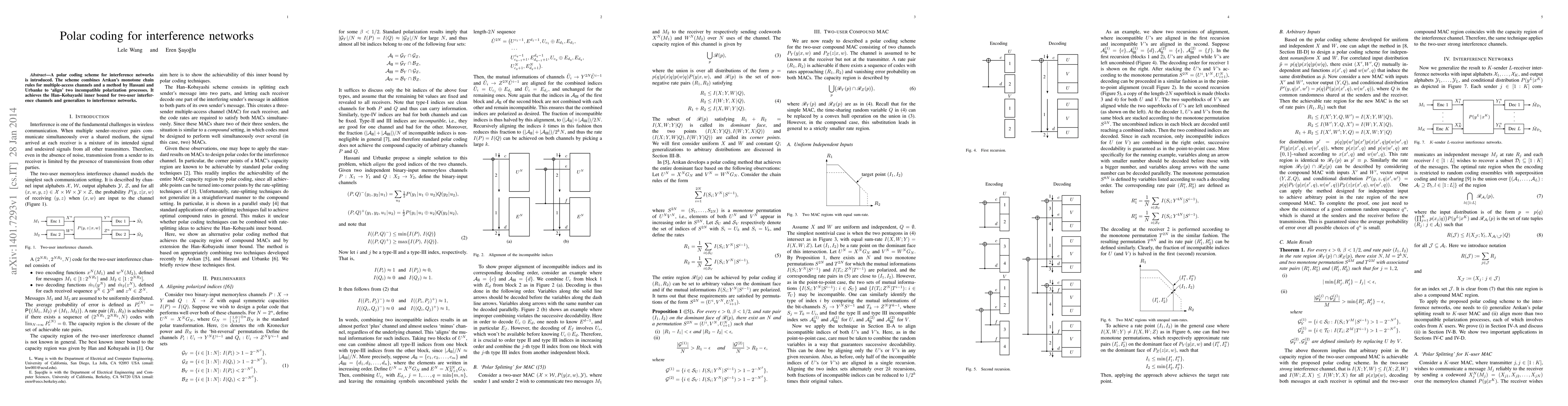 Summary: This paper presents a polar coding scheme for interference networks that combines Arikan's monotone chain rules and a method to align polarization processes, achieving the Han-Kobayashi inner bound for two-user channels and extending to larger networks.