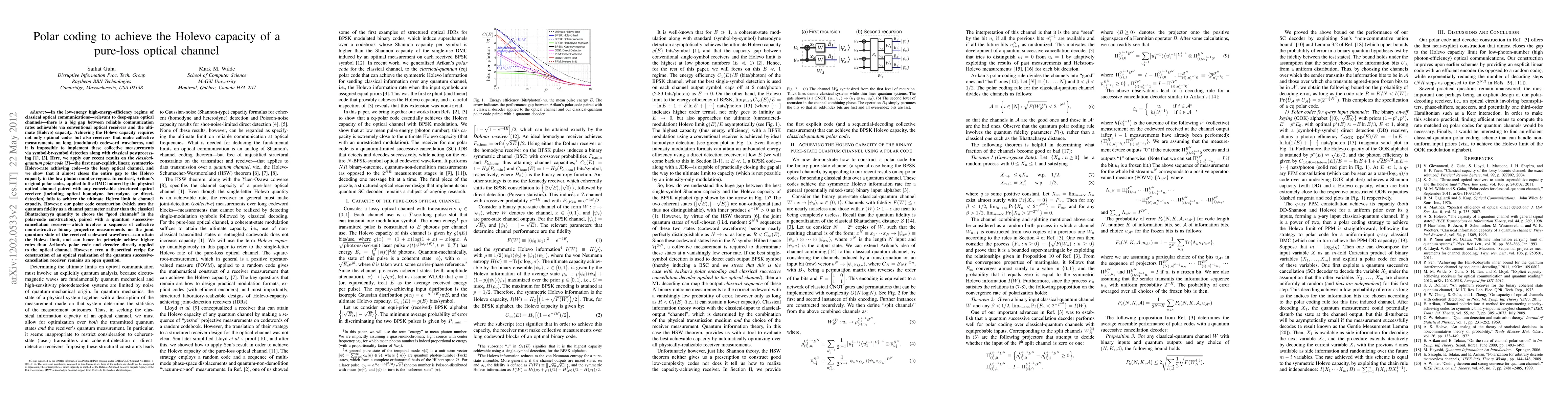 In the low-energy high-energy-efficiency regime of classical optical communications---relevant to deep-space optical channels---there is a big gap between reliable communication rates achievable via conventional optical receivers and the ultimate (Holevo) capacity. Achieving the Holevo capacity requires not only optimal codes but also receivers that make collective measurements on long (modulated) codeword waveforms, and it is impossible to implement these collective measurements via symbol-by-symbol detection along with classical postprocessing. Here, we apply our recent results on the classical-quantum polar code---the first near-explicit, linear, symmetric-Holevo-rate achieving code---to the lossy optical channel, and we show that it almost closes the entire gap to the Holevo capacity in the low photon number regime. In contrast, Arikan's original polar codes, applied to the DMC induced by the physical optical channel paired with any conceivable structured optical receiver (including optical homodyne, heterodyne, or direct-detection) fails to achieve the ultimate Holevo limit to channel capacity. However, our polar code construction (which uses the quantum fidelity as a channel parameter rather than the classical Bhattacharyya quantity to choose the "good channels" in the polar-code construction), paired with a quantum successive-cancellation receiver---which involves a sequence of collective non-destructive binary projective measurements on the joint quantum state of the received codeword waveform---can attain the Holevo limit, and can hence in principle achieve higher rates than Arikan's polar code and decoder directly applied to the optical channel. However, even a theoretical recipe for construction of an optical realization of the quantum successive-cancellation receiver remains an open question.