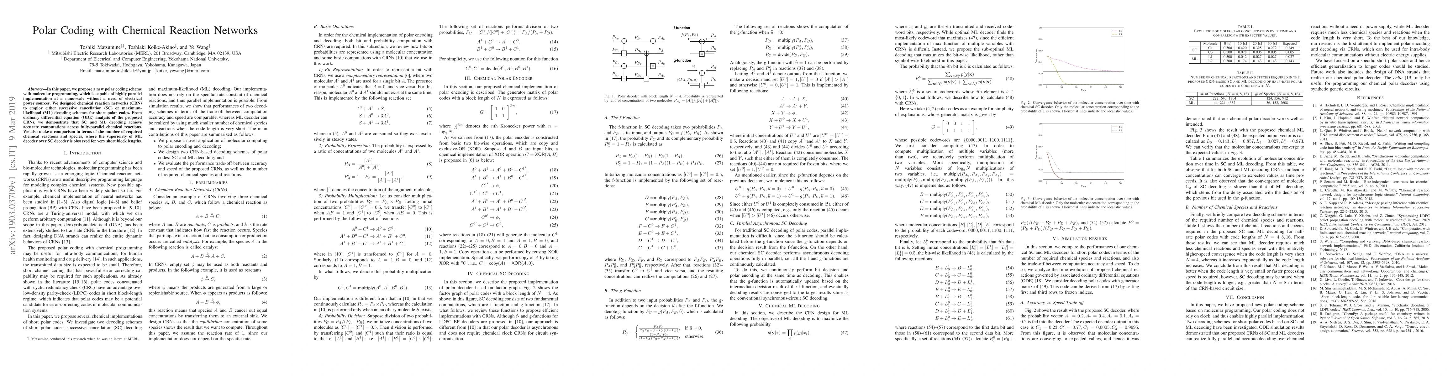 This paper introduces a novel polar coding scheme utilizing chemical reaction networks for nano-scale, parallel computation without electrical power. It demonstrates accurate successive cancellation and maximum-likelihood decoding through ordinary differential equation analysis, showing that the maximum-likelihood decoder is more efficient for short polar codes.