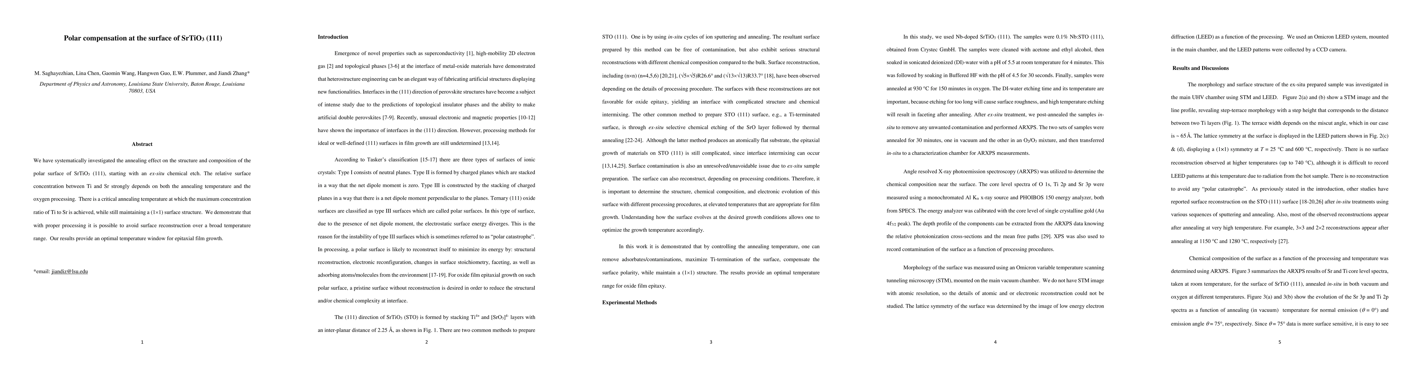 We have systematically investigated the annealing effect on the structure and composition of the polar surface of SrTiO3 (111), starting with an ex-situ chemical etch. The relative surface concentration between Ti and Sr strongly depends on both the annealing temperature and the oxygen processing. There is a critical annealing temperature at which the maximum concentration ratio of Ti to Sr is achieved, while still maintaining a (1 x 1) surface structure. We demonstrate that with proper processing it is possible to avoid surface reconstruction over a broad temperature range. Our results provide an optimal temperature window for epitaxial film growth.