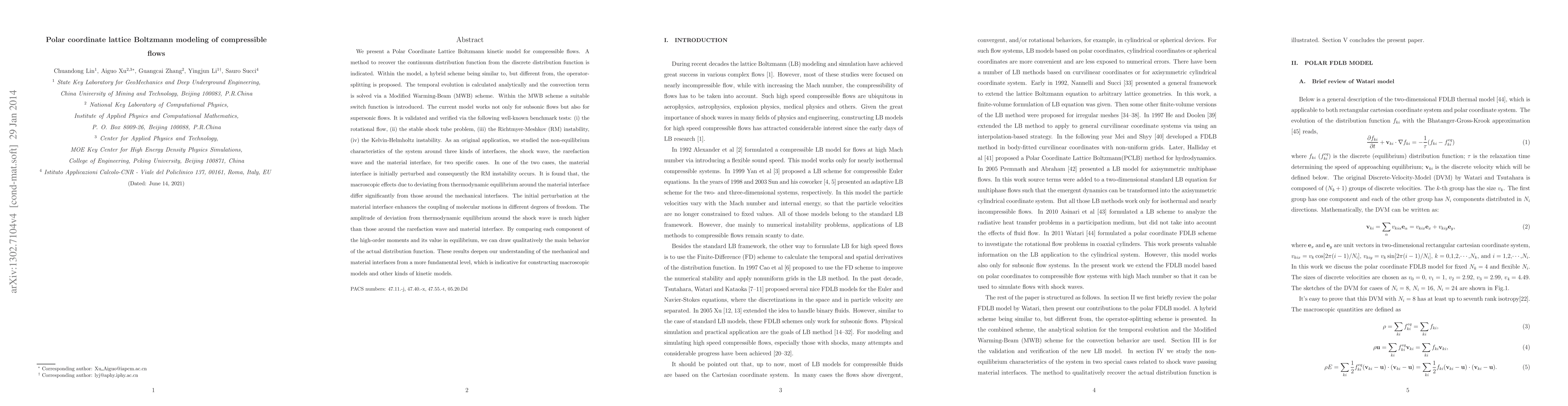 We present a polar coordinate lattice Boltzmann kinetic model for compressible flows. A method to recover the continuum distribution function from the discrete distribution function is indicated. Within the model, a hybrid scheme being similar to, but different from, the operator splitting is proposed. The temporal evolution is calculated analytically, and the convection term is solved via a modifiedWarming-Beam (MWB) scheme.Within theMWB scheme a suitable switch function is introduced. The current model works not only for subsonic flows but also for supersonic flows. It is validated and verified via the following well-known benchmark tests: (i) the rotational flow, (ii) the stable shock tube problem, (iii) the Richtmyer-Meshkov (RM) instability, and (iv) the Kelvin-Helmholtz instability. As an original application, we studied the nonequilibrium characteristics of the system around three kinds of interfaces, the shock wave, the rarefaction wave, and the material interface, for two specific cases. In one of the two cases, the material interface is initially perturbed, and consequently the RMinstability occurs. It is found that themacroscopic effects due to deviating from thermodynamic equilibrium around thematerial interface differ significantly from those around the mechanical interfaces. The initial perturbation at the material interface enhances the coupling of molecular motions in different degrees of freedom. The amplitude of deviation from thermodynamic equilibrium around the shock wave is much higher than those around the rarefaction wave and material interface. By comparing each component of the high-order moments and its value in equilibrium, we can draw qualitatively the main behavior of the actual distribution function.